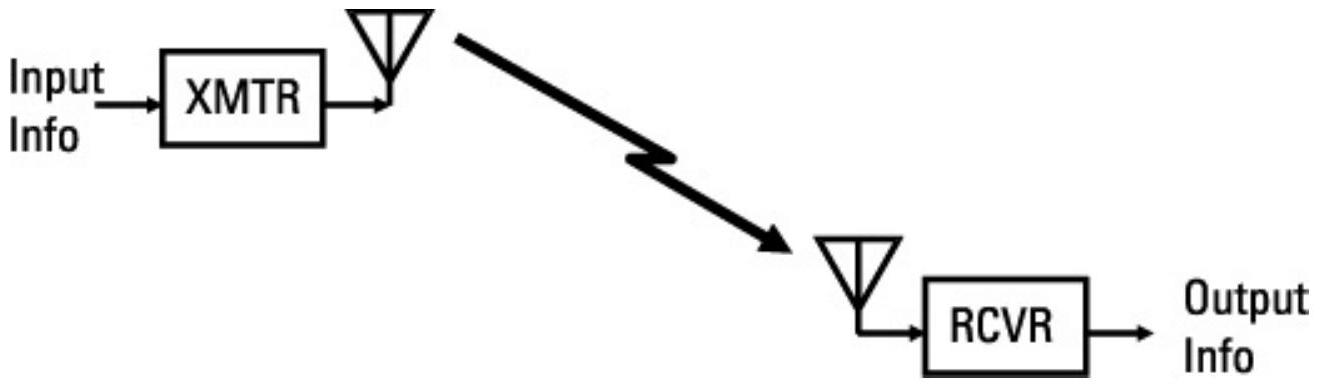 电子战(EW)对雷达和对通信的最大差别在于,雷达通常使用双向链路,即发射机和接收机通常(但并非总是)位于同一位置,且发射信号经目标反射返回。而在通信中,发射机和接收机位于不同的位置。各种通信系统的目的都是将信息从一个位置传送到另一个位置。因此,通信使用的是如图 6.1 所示的单向通信链路。