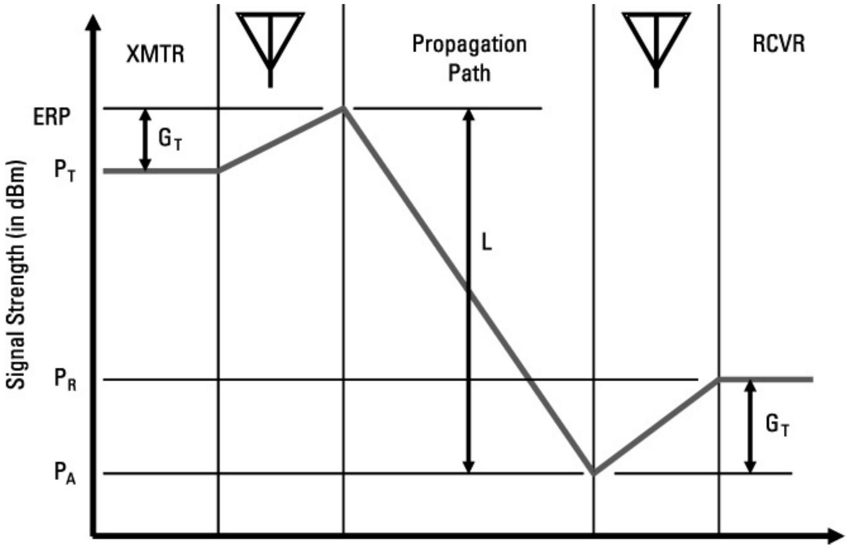 单向链路包括一个发射机、一个接收机、发射与接收天线,以及信号在两天线之间传输过程中发生的一切。图 6.2 是一个表示单向链路方程的示意图。该图的横坐标并非比例尺,而是用于展示信号在链路中传输时电平的变化。纵坐标是链路中各点的信号强度(以 dBm 表示)。发射功率是发射天线的输入。图中天线增益显示为正值,尽管在实际中任何天线的增益(以分贝表示)都可能为正或负。需要强调的是,这里的增益是指发射天线在接收天线方向上的增益。发射天线的输出称为等效辐射功率(ERP),单位为 dBm。需要注意的是,这里使用 dBm 单位并不严格正确;实际上,此时的信号是功率密度,正确单位应为微伏每米。然而,如果我们假设在发射天线旁边放置一个理想的各向同性天线(忽略近场效应),该天线的输出功率强度即可用 dBm 表示。利用这个理想天线的假设,我们可以在整个链路中用 dBm 来讨论信号强度而无需换算单位,这是一种被广泛接受的做法。信号强度与场强之间的换算公式为: