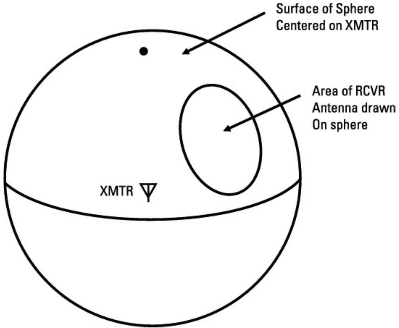 图6.6 视距损耗是以发射机为中心、半径等于传播距离的球面表面积与接收天线有效面积的比值。