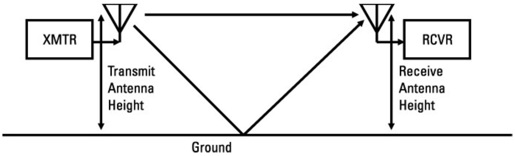 当发射和接收天线靠近单一主导反射面(如地面或水面),且天线方向图足够宽以覆盖该反射面时,必须考虑双径传播模型。正如我们将看到的,发射频率和实际天线高度决定了适用的是双径传播模型还是视距(LOS)传播模型。