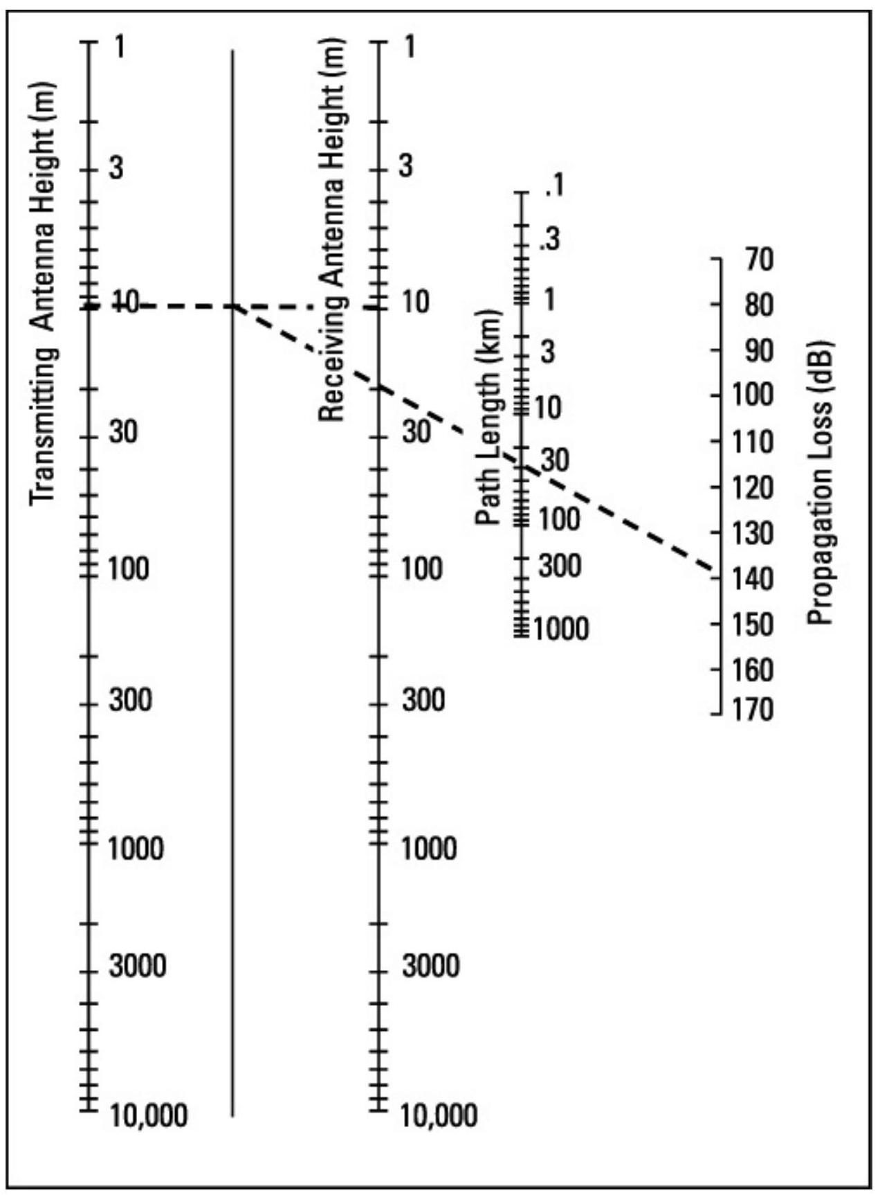 图 6.9 给出了计算双径损耗的诺莫图。使用方法为:首先在发射和接收天线高度之间画一条直线。然后,从该直线与索引线的交点处画一条线,穿过路径长度,延伸到传播损耗线。在示例中,两副高度为 \(10\,\mathrm{m}\) 的天线相距 30 km,衰减略低于 140 dB。若利用上述公式计算,实际值为 139 dB。