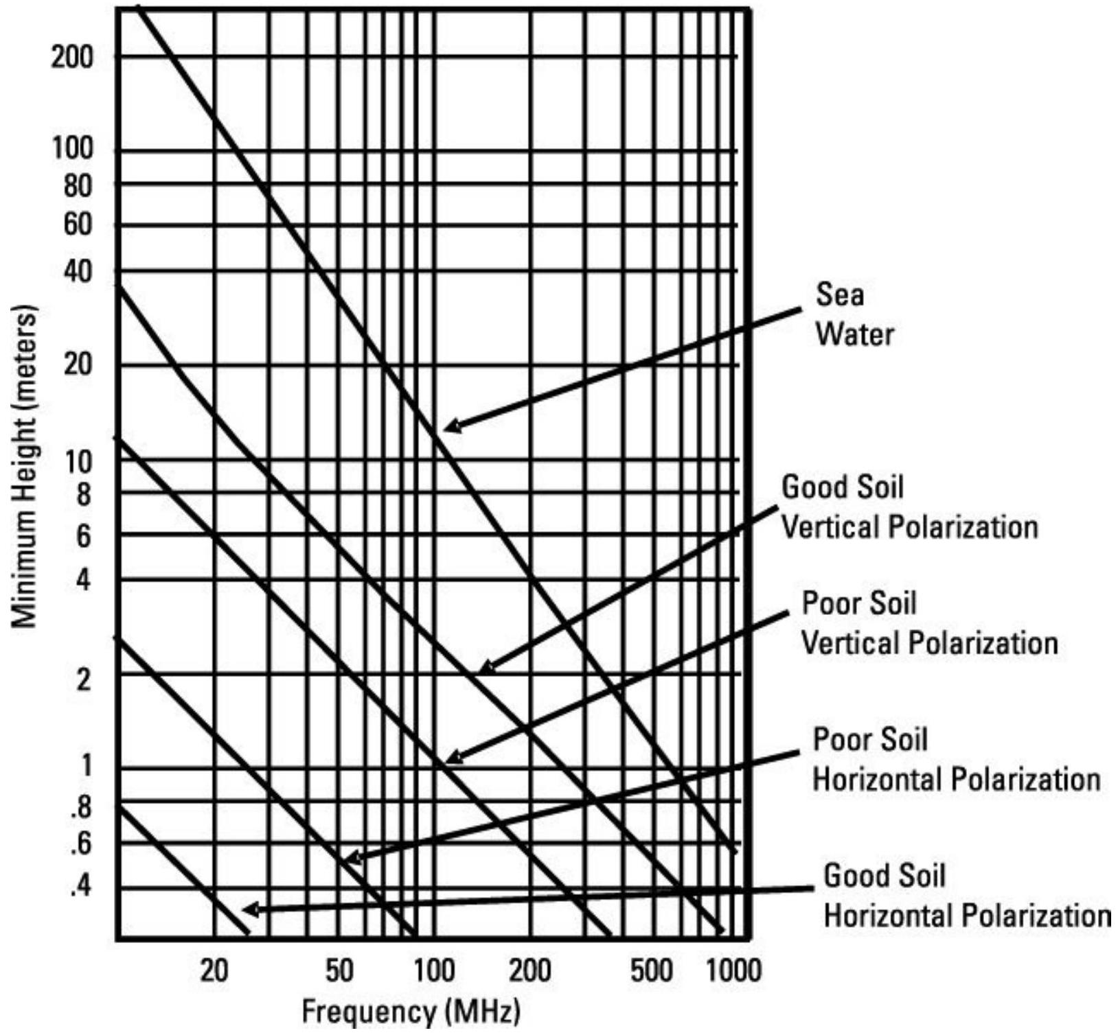 图 6.10 显示了双径传播计算所需的最小天线高度与传输频率的关系。图中共有五条曲线,分别对应: