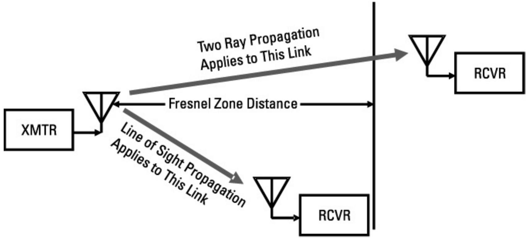 图6.11 如果链路长度短于菲涅尔区距离,则采用视距传播;如果链路长度长于菲涅尔区距离,则采用双径传播。