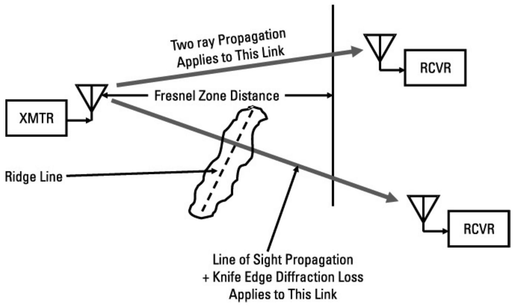 图 6.13 即使链路距离大于菲涅尔区距离,只要中间存在山脊线,仍需采用视距传播模型。