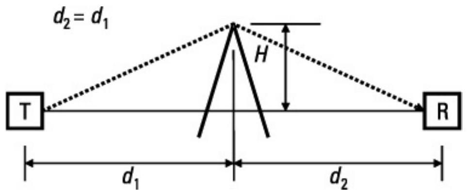 图 6.14 刀刃衍射几何关系由发射端到刀刃的距离、刀刃到接收端的距离,以及刀刃相对于假想视距路径的高度决定。