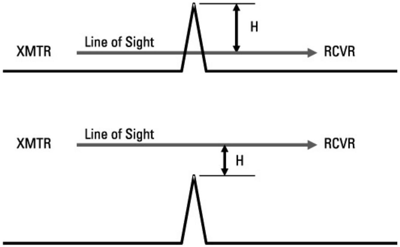 图 6.15 视距路径可能在刀刃上方或下方通过。若未高出太多,仍会产生刀刃衍射损耗。