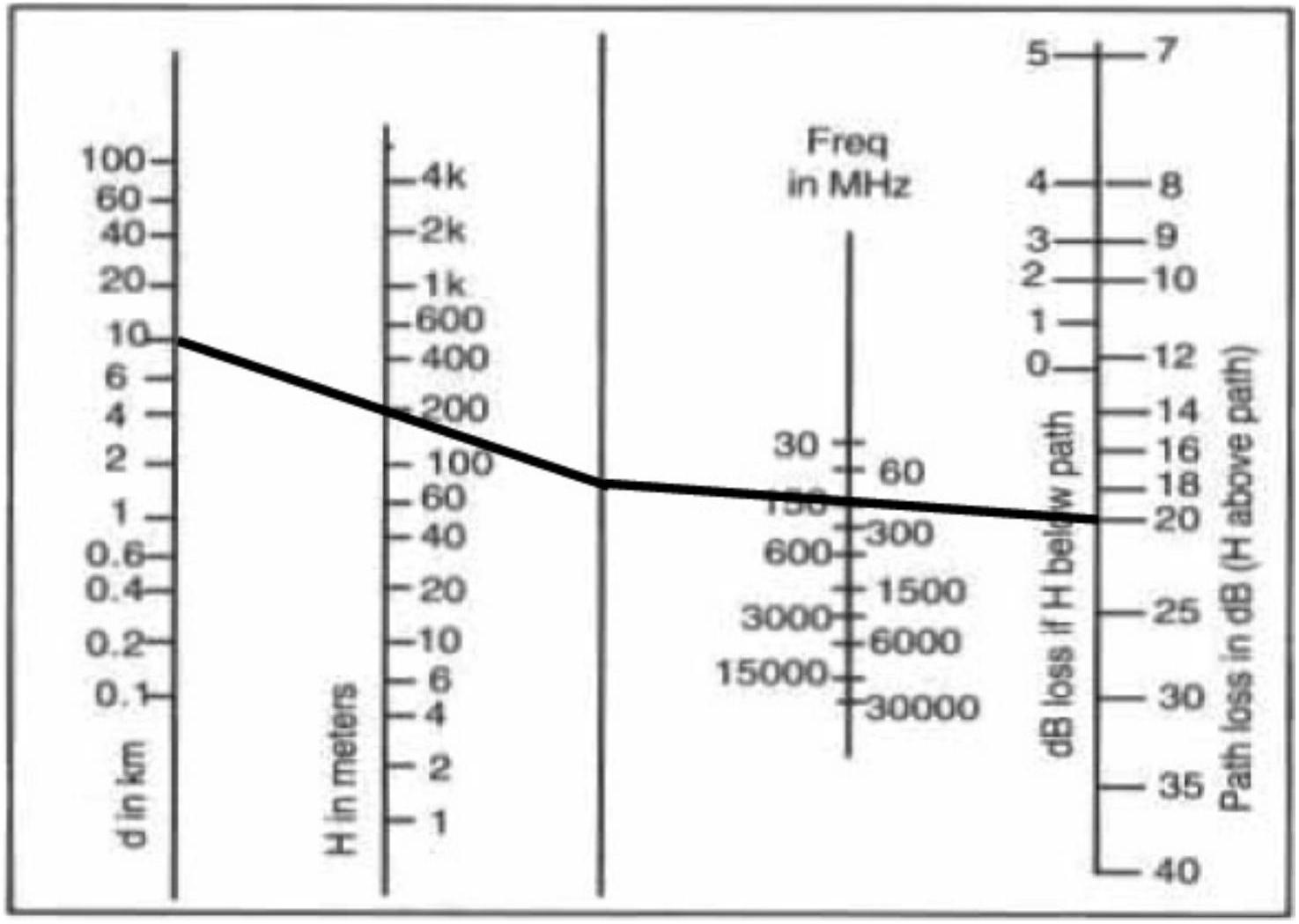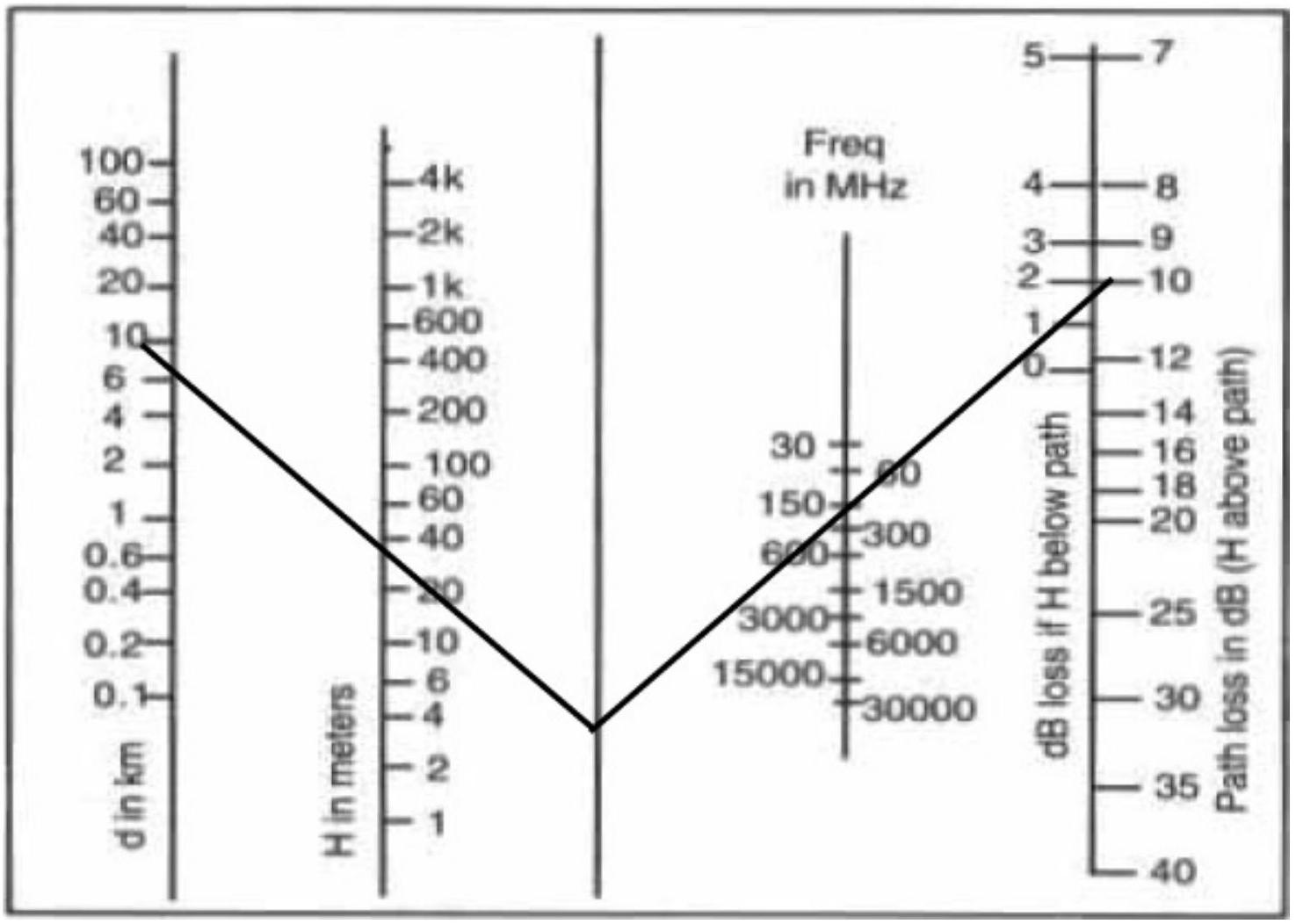 图6.7 从频率值到传输距离值画一条直线,其交点对应于视距损耗值。