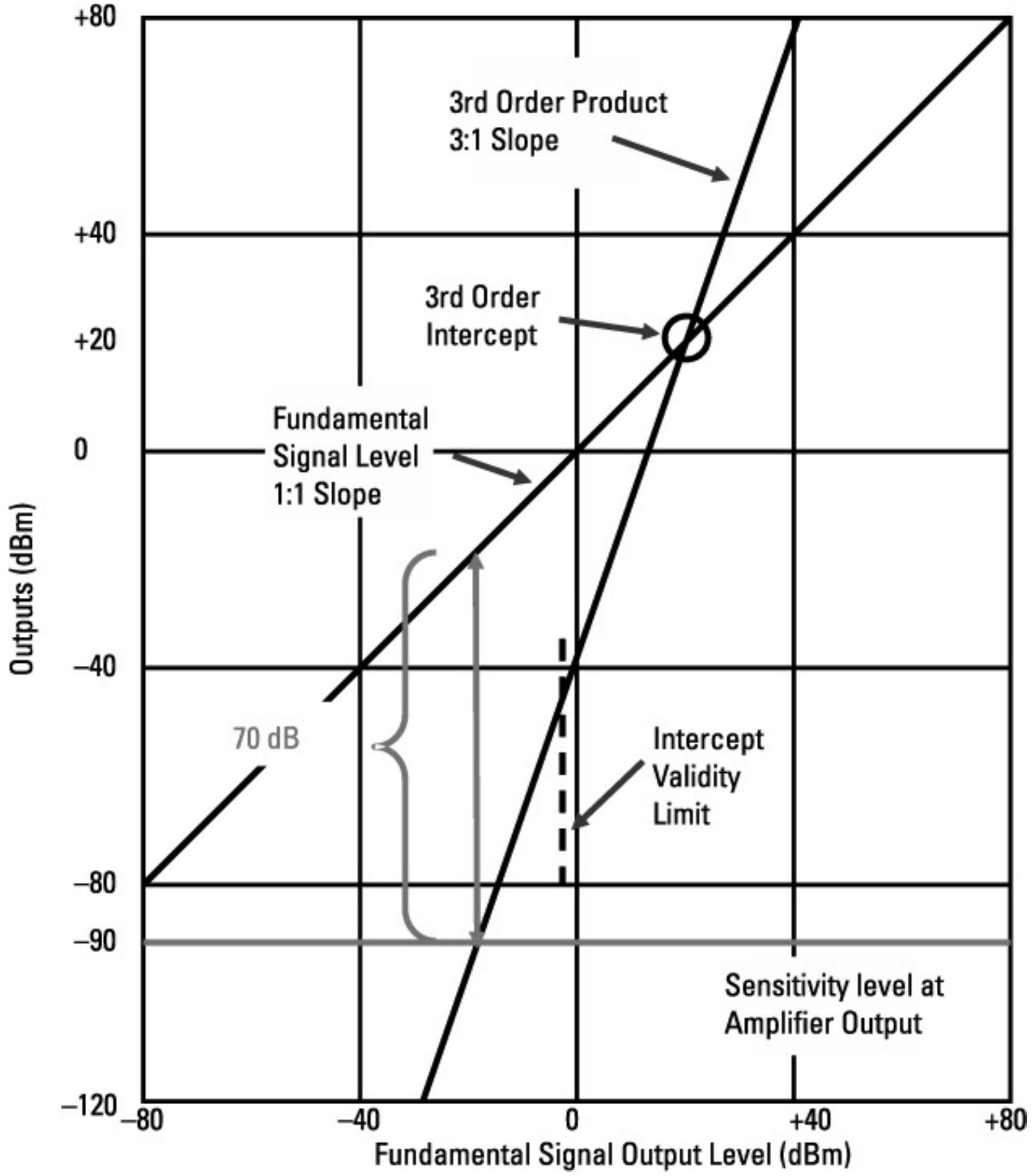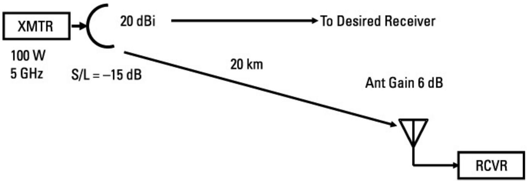 目标信号 ERP 为 \(30\ \mathrm{dBm}\ (1\ \mathrm{W})+20\ \mathrm{dB}=50\ \mathrm{dBm}\)。干扰机 ERP 为 \(50\ \mathrm{dBm}\ (100\ \mathrm{W})+10\ \mathrm{dB}=60\ \mathrm{dBm}\)。