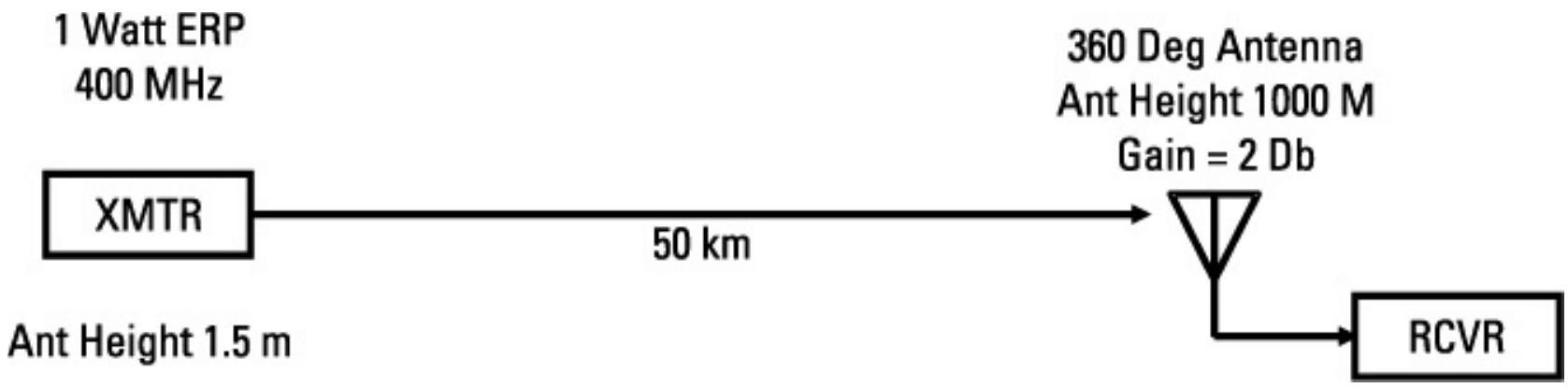 这小于 500 m 的干扰链路距离,因此适用双径传播。干扰机 ERP 为 \(37\ \mathrm{dBm}\)(5 W)。干扰链路损耗为: