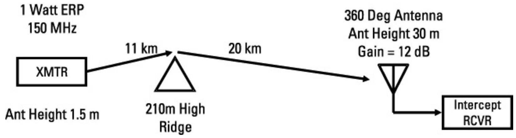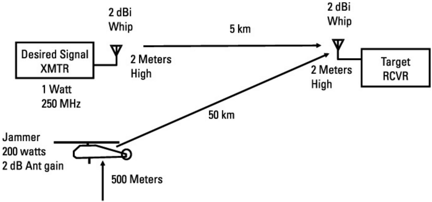 让我们直接进入最复杂的情况:目标通信链路和干扰机均位于地面,如图 6.87 所示。在该问题中,目标链路工作在 250 MHz 频率、传输距离 5 km,发射机功率为 1 W。发射和接收天线均为 2-dBi 鞭状天线,安装高度为 2 m。干扰机功率为 500 W,配备 12-dBi 对数周期天线,安装在 30 m 高的桅杆上,距离目标接收机 50 km。三者之间均为视距内。我们希望计算实现的 \(J / S\)。