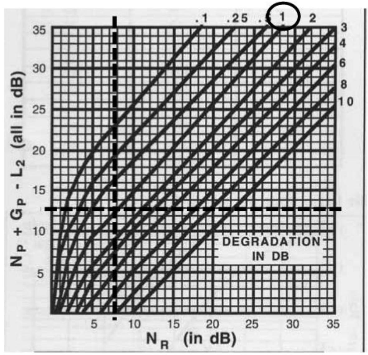 再从该交点引一条连线,穿过传输频率值(MHz),延伸至右侧刻度,即可得到 KED 衰减值。在此时再区分 \(H\) 的方向:若 \(H\) 为刀刃上方距离,则在左刻度读取 KED 衰减;若 \(H\) 为刀刃下方距离,则在右刻度读取。