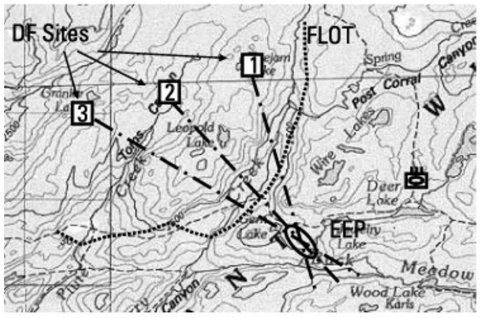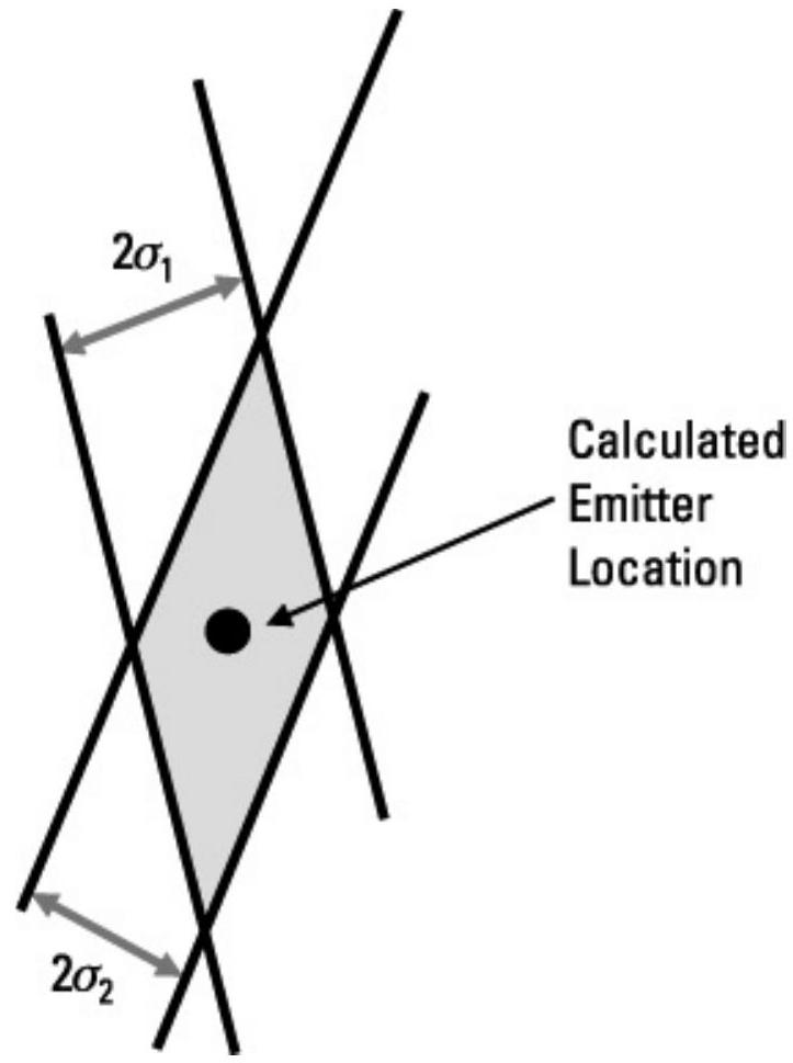 如果绘制一个与平行四边形方向一致的椭圆,但定义一个包含实际发射机位置概率为 \(50\%\) 的区域,如图 6.81 所示,这将是 EEP。