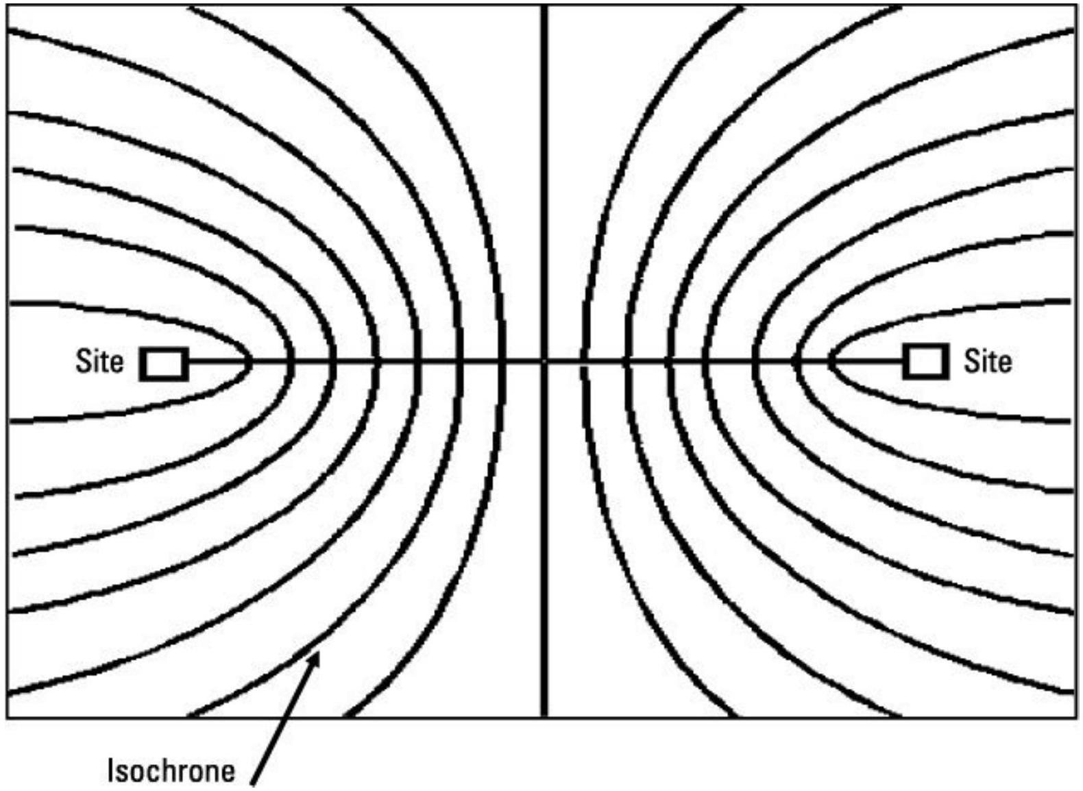 图 6.79 等时线或等频线的“宽度”通常定义为从计算曲线向两侧偏移的 \(\pm 1 \sigma\) 轮廓间的间隔。