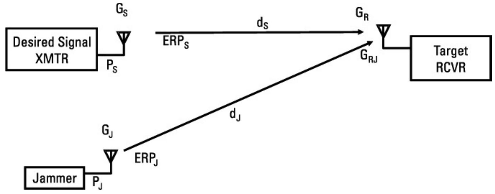 由于干扰机非常接近目标接收机,即使低功率干扰机也能实现较高的 \(\mathrm{J} / \mathrm{S}\)。
