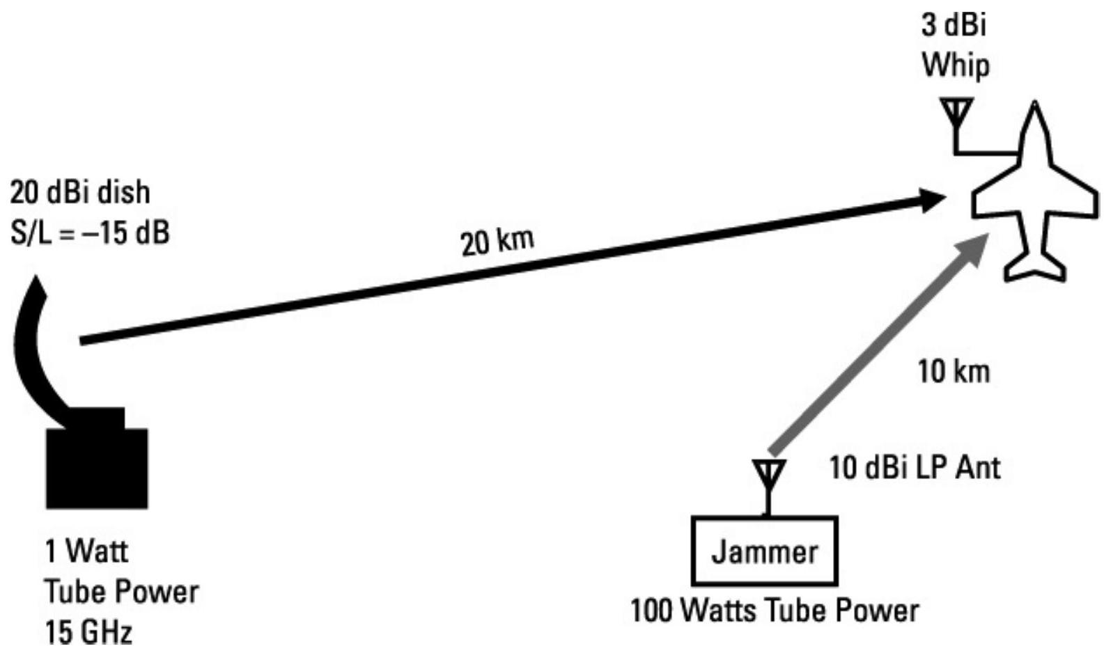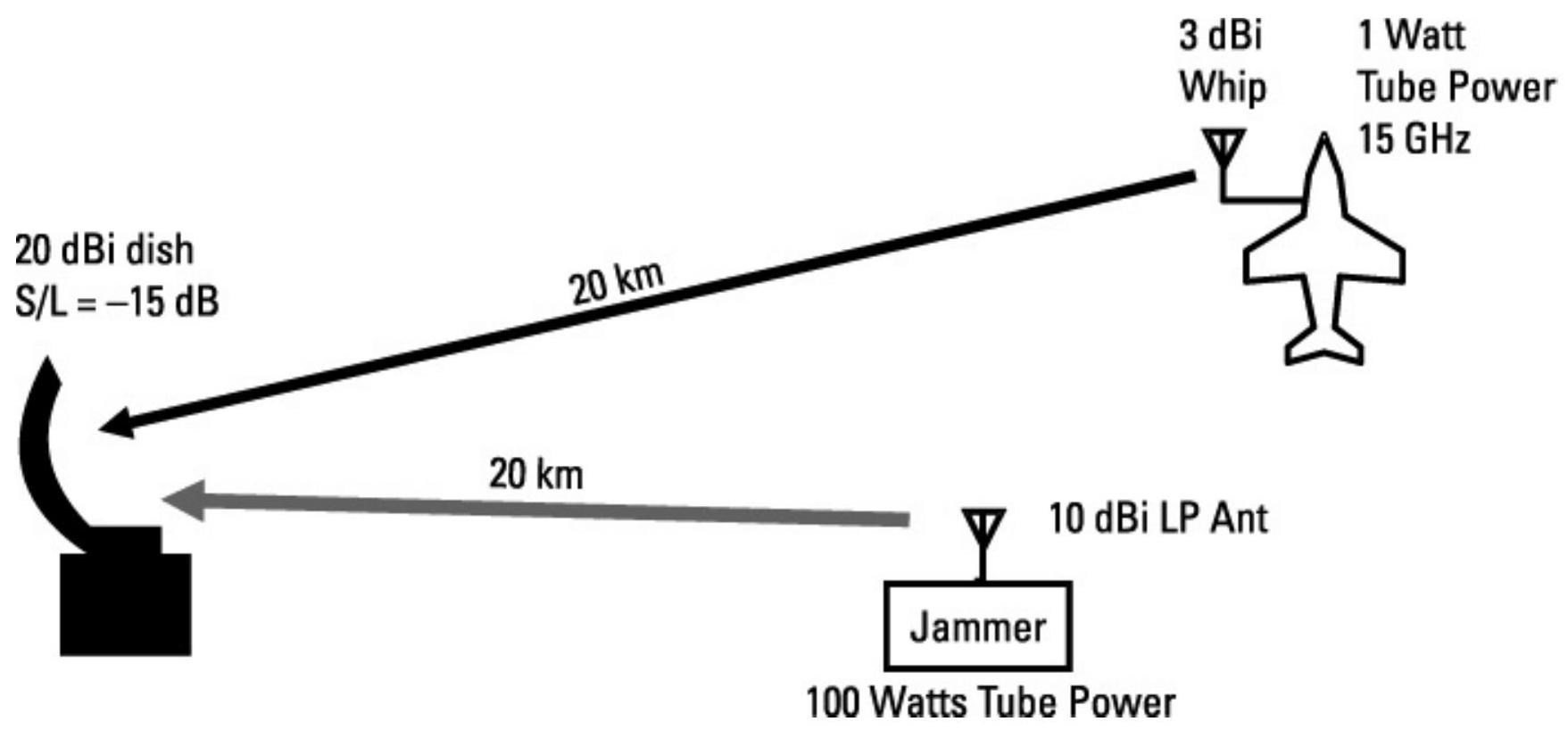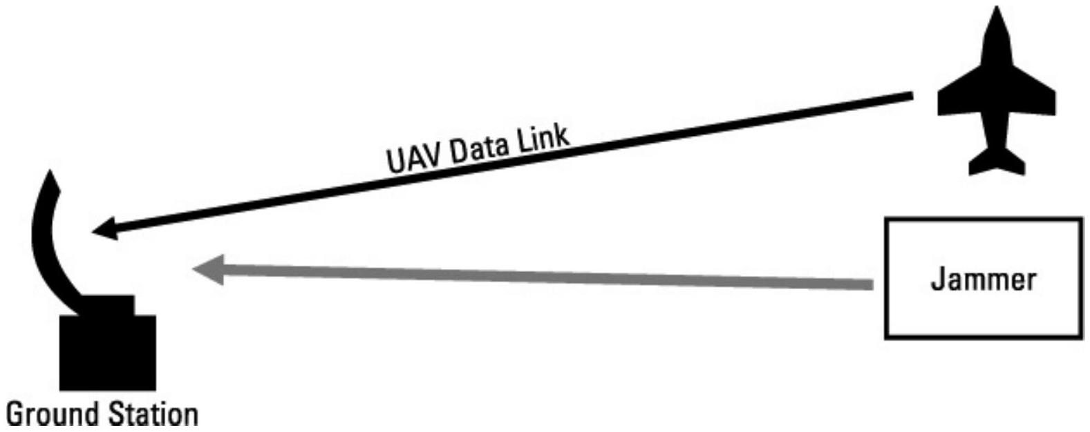 接下来考虑从地面对 UAV 链路进行干扰。UAV 必须具有来自控制站的指令链(上行链路)以及返回控制站的数据链(下行链路)。我们将分别讨论干扰每条链路。两条链路的工作频率均约为 5 GHz。