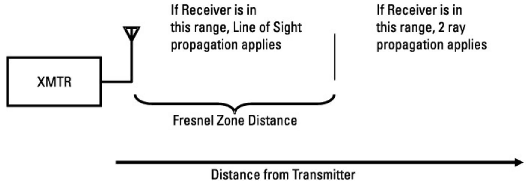 图 6.88 适用的传播模型取决于链路距离与 Fresnel 区距离的关系。