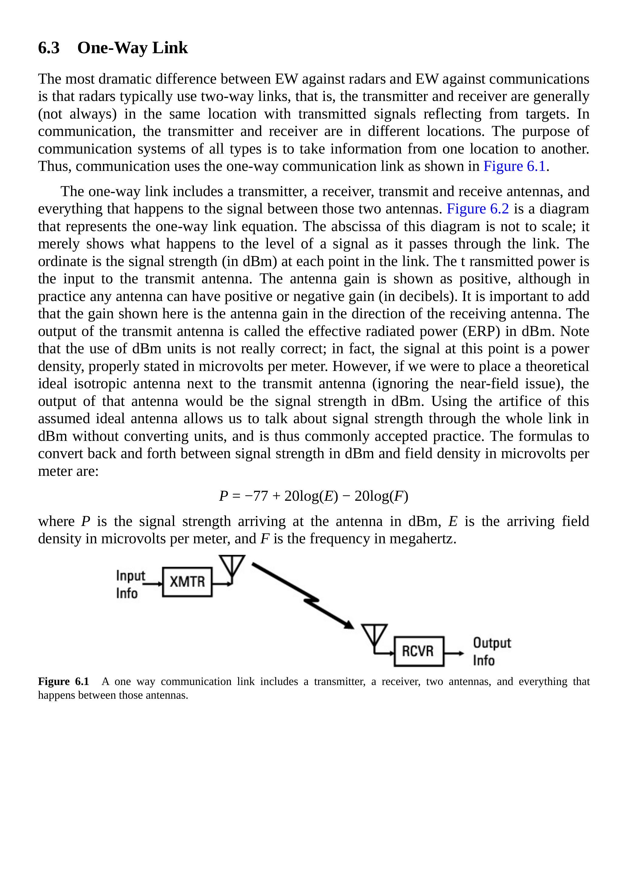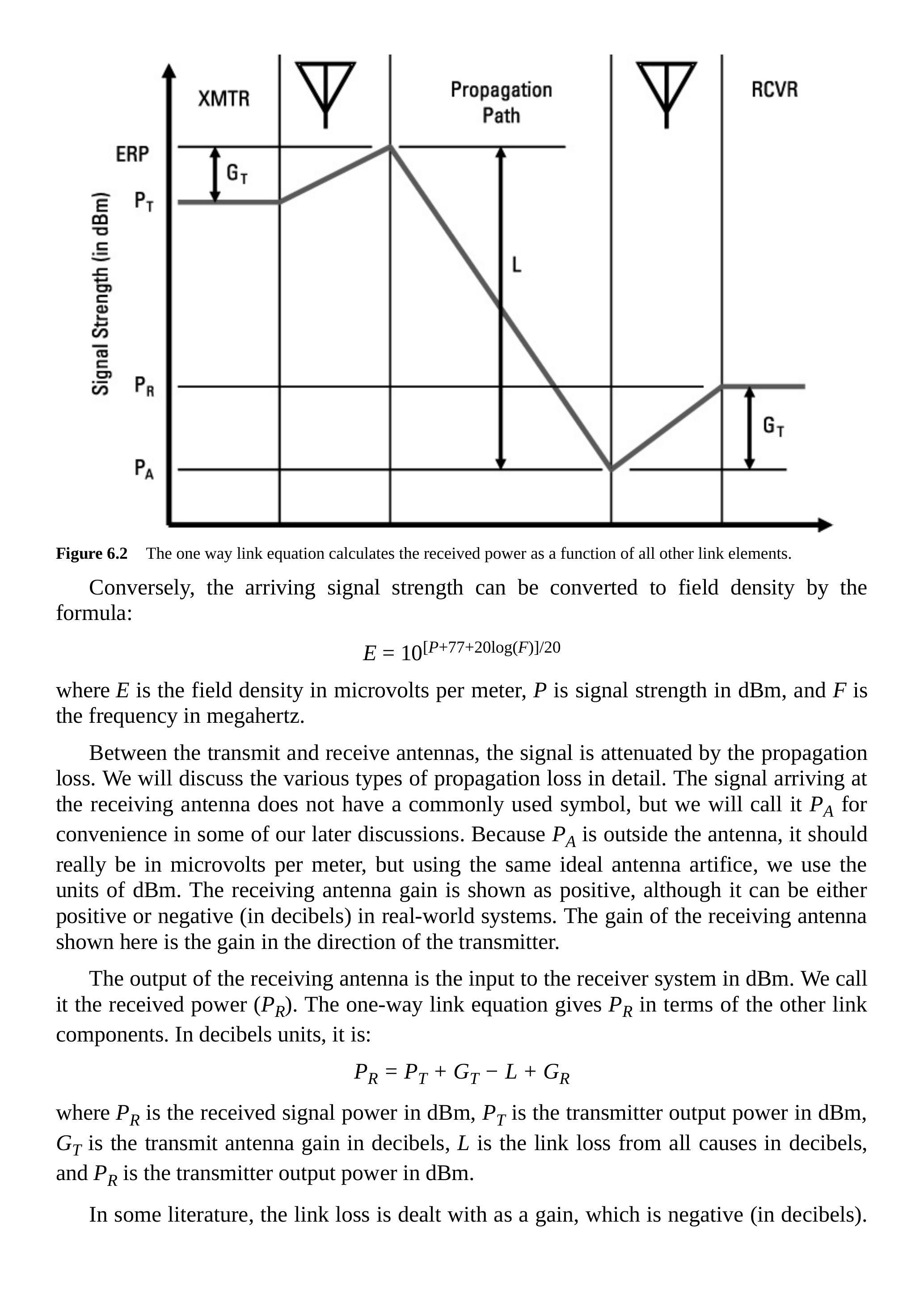 单向链路包括一个发射机、一个接收机、发射与接收天线,以及信号在两天线之间传输过程中发生的一切。图 6.2 是一个表示单向链路方程的示意图。该图的横坐标并非比例尺,而是用于展示信号在链路中传输时电平的变化。纵坐标是链路中各点的信号强度(以 dBm 表示)。发射功率是发射天线的输入。图中天线增益显示为正值,尽管在实际中任何天线的增益(以分贝表示)都可能为正或负。需要强调的是,这里的增益是指发射天线在接收天线方向上的增益。发射天线的输出称为等效辐射功率(ERP),单位为 dBm。需要注意的是,这里使用 dBm 单位并不严格正确;实际上,此时的信号是功率密度,正确单位应为微伏每米。然而,如果我们假设在发射天线旁边放置一个理想的各向同性天线(忽略近场效应),该天线的输出功率强度即可用 dBm 表示。利用这个理想天线的假设,我们可以在整个链路中用 dBm 来讨论信号强度而无需换算单位,这是一种被广泛接受的做法。信号强度与场强之间的换算公式为: