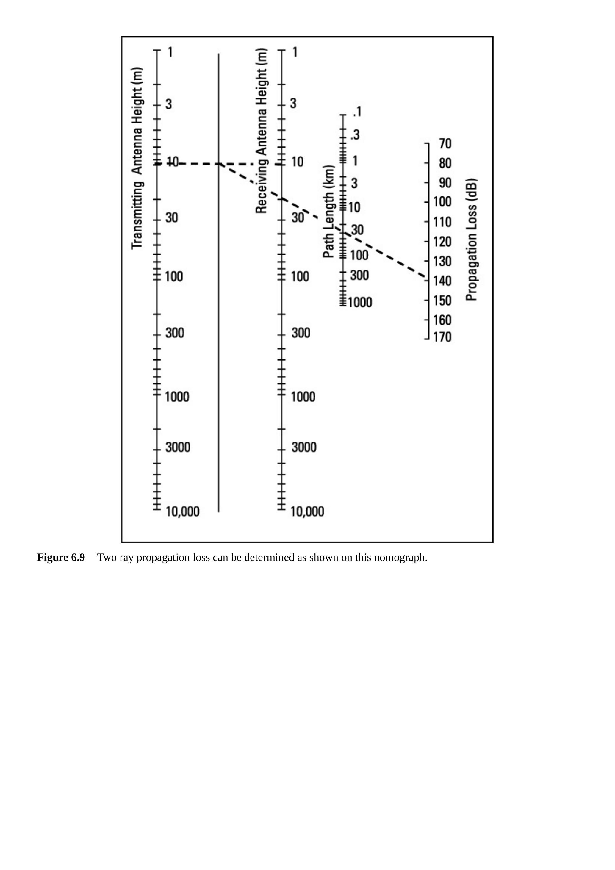 图 6.9 给出了计算双径损耗的诺莫图。使用方法为:首先在发射和接收天线高度之间画一条直线。然后,从该直线与索引线的交点处画一条线,穿过路径长度,延伸到传播损耗线。在示例中,两副高度为 \(10\,\mathrm{m}\) 的天线相距 30 km,衰减略低于 140 dB。若利用上述公式计算,实际值为 139 dB。