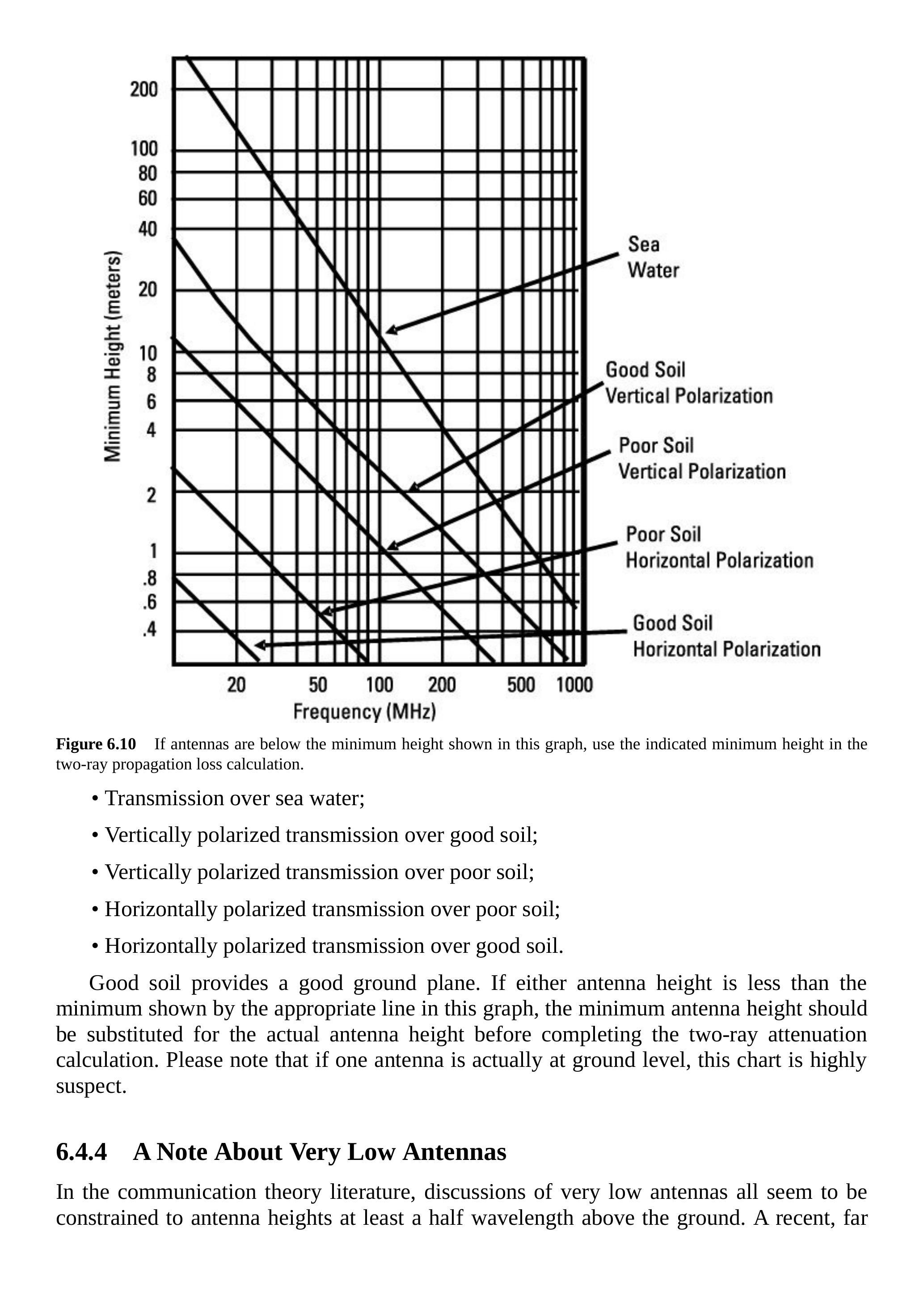 图6.10 如果天线低于该图中所示的最小高度,则在双径传播损耗计算中应采用图中给出的最小高度。