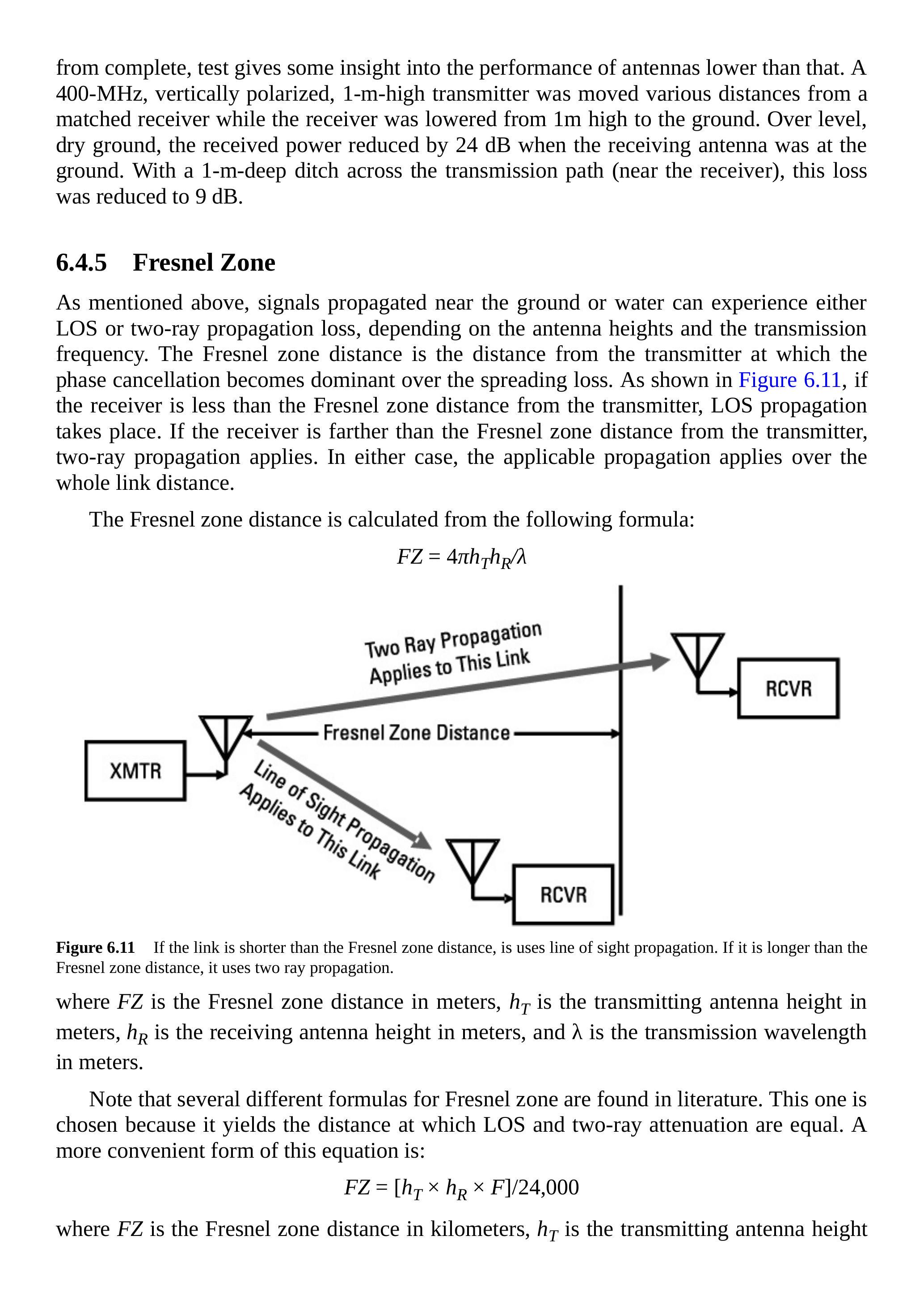 如前所述,接近地面或水面的传播信号可能经历 LOS 或双径传播损耗,这取决于天线高度和传输频率。菲涅尔区距离定义为从发射机起算、相位抵消开始在传播损耗中占主导的距离。如图 6.11 所示,如果接收机距发射机的距离小于菲涅尔区距离,则采用 LOS 传播;若接收机距离大于菲涅尔区距离,则采用双径传播。在任一情况下,整个链路均服从相应的传播模型。