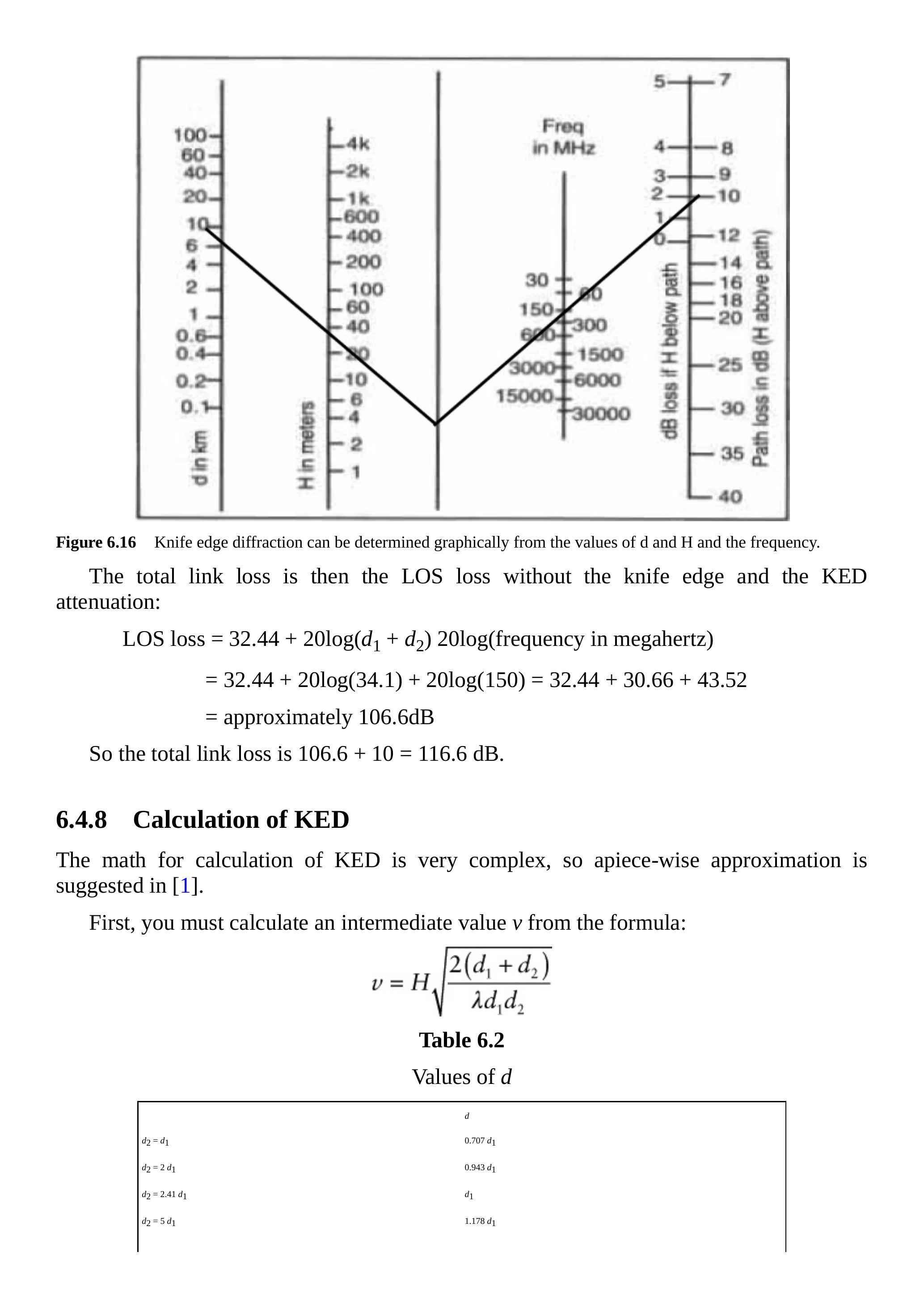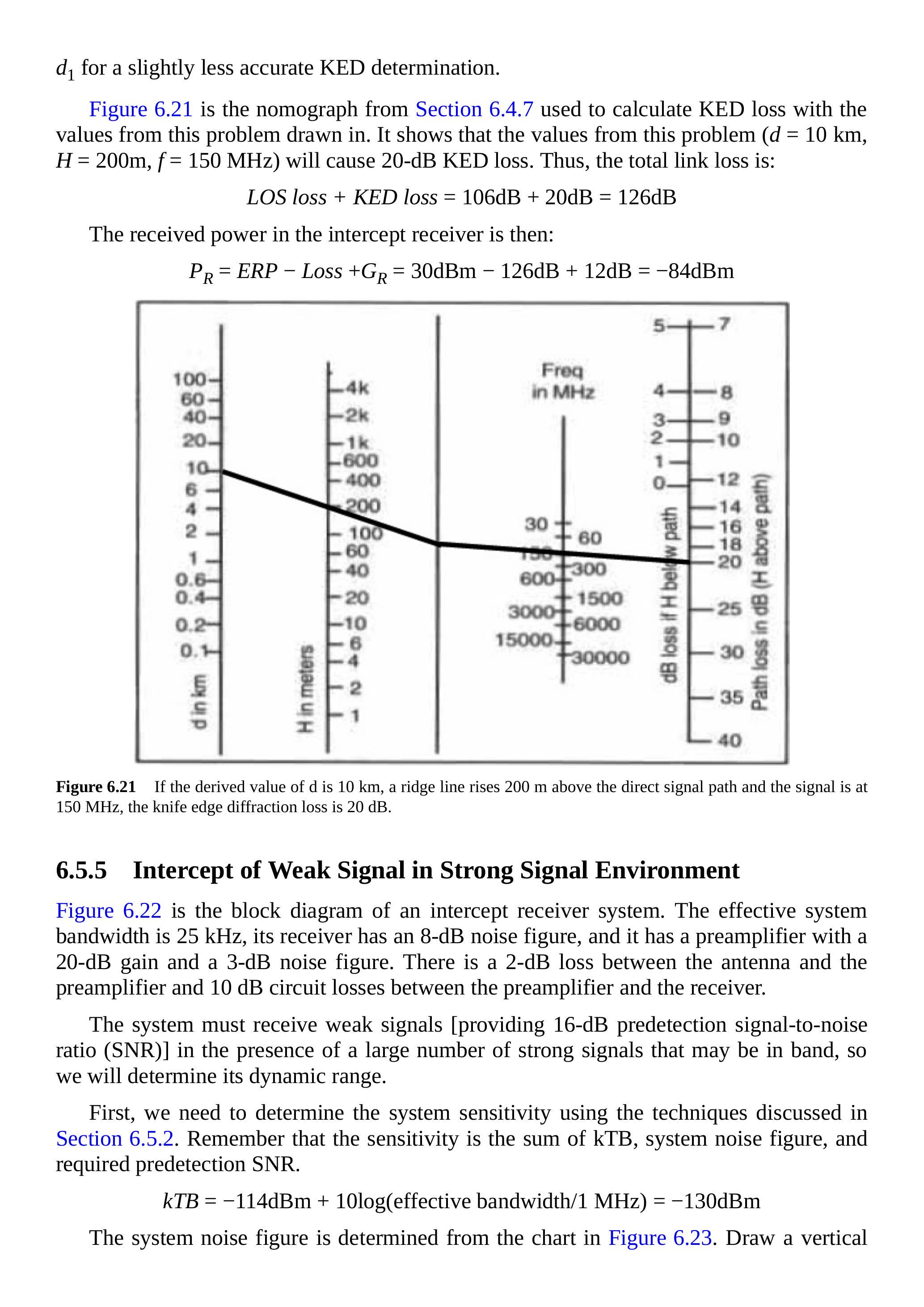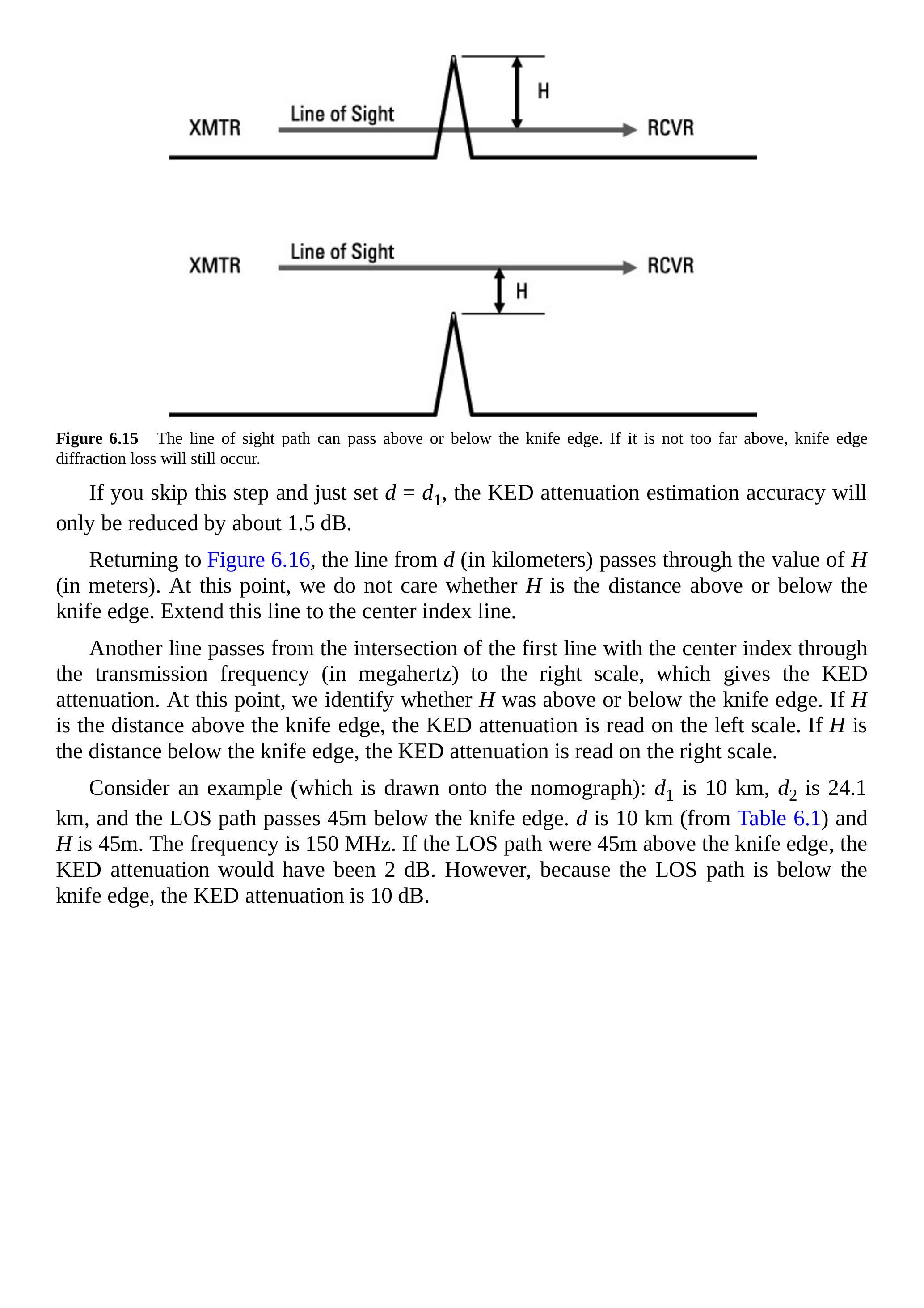 举例说明(标注在标尺图上):\(d_{1}=10\,\mathrm{km}\),\(d_{2}=24.1\,\mathrm{km}\),视距路径低于刀刃 45 m。由表 6.2 可知 \(d=10\,\mathrm{km}\),\(H=45\,\mathrm{m}\),频率为 150 MHz。若视距路径在刀刃上方 45 m,KED 衰减为 2 dB;但由于其在刀刃下方 45 m,KED 衰减为 10 dB。