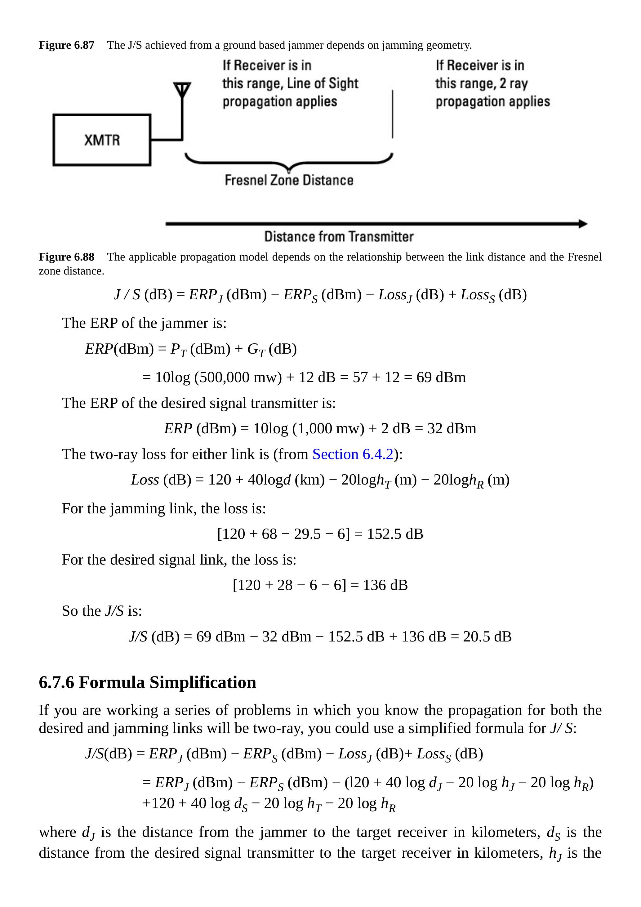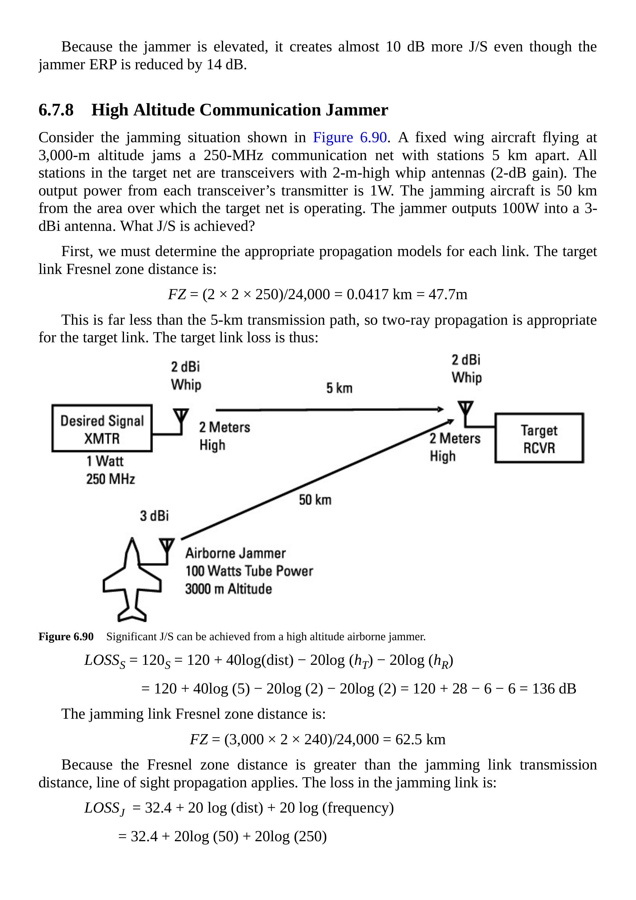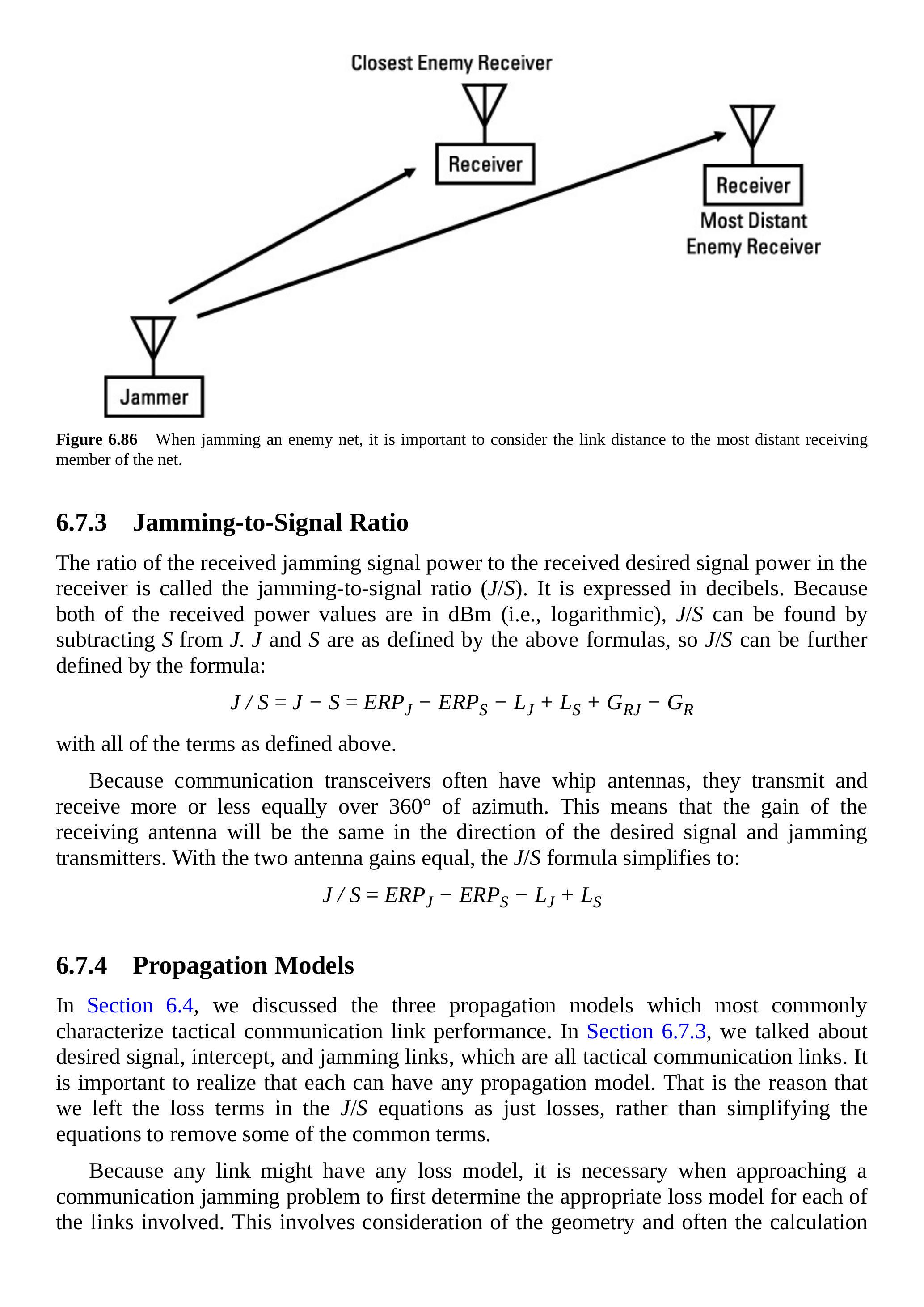 在第 6.4 节中,我们讨论了最常用来描述战术通信链路性能的三种传播模型。在第 6.7.3 节中,我们讨论了期望信号链路、截获链路和干扰链路,它们都是战术通信链路。重要的是要意识到,每条链路都可以采用任意传播模型。这也是我们在 \(J / S\) 方程中将损耗项保留为一般损耗而没有简化公式去掉公共项的原因。