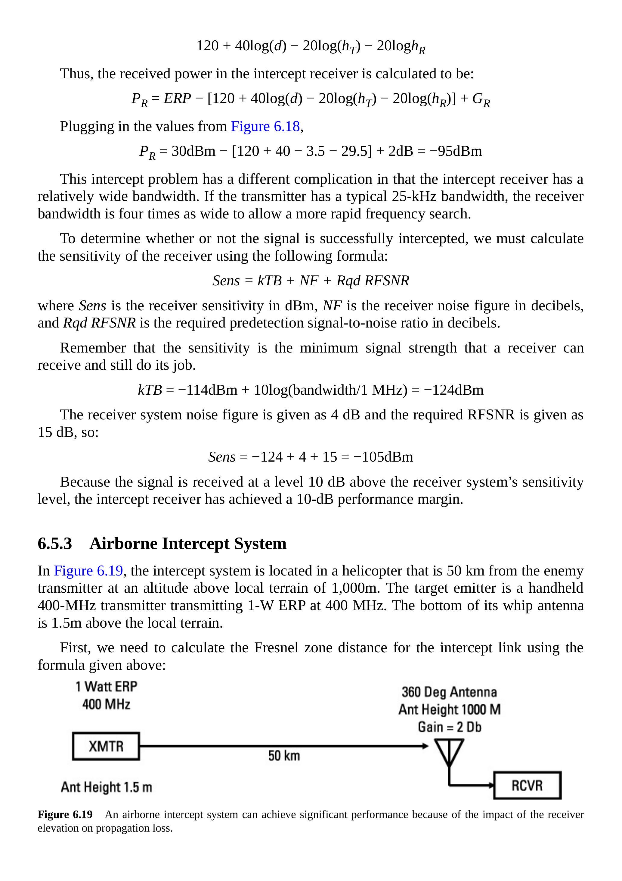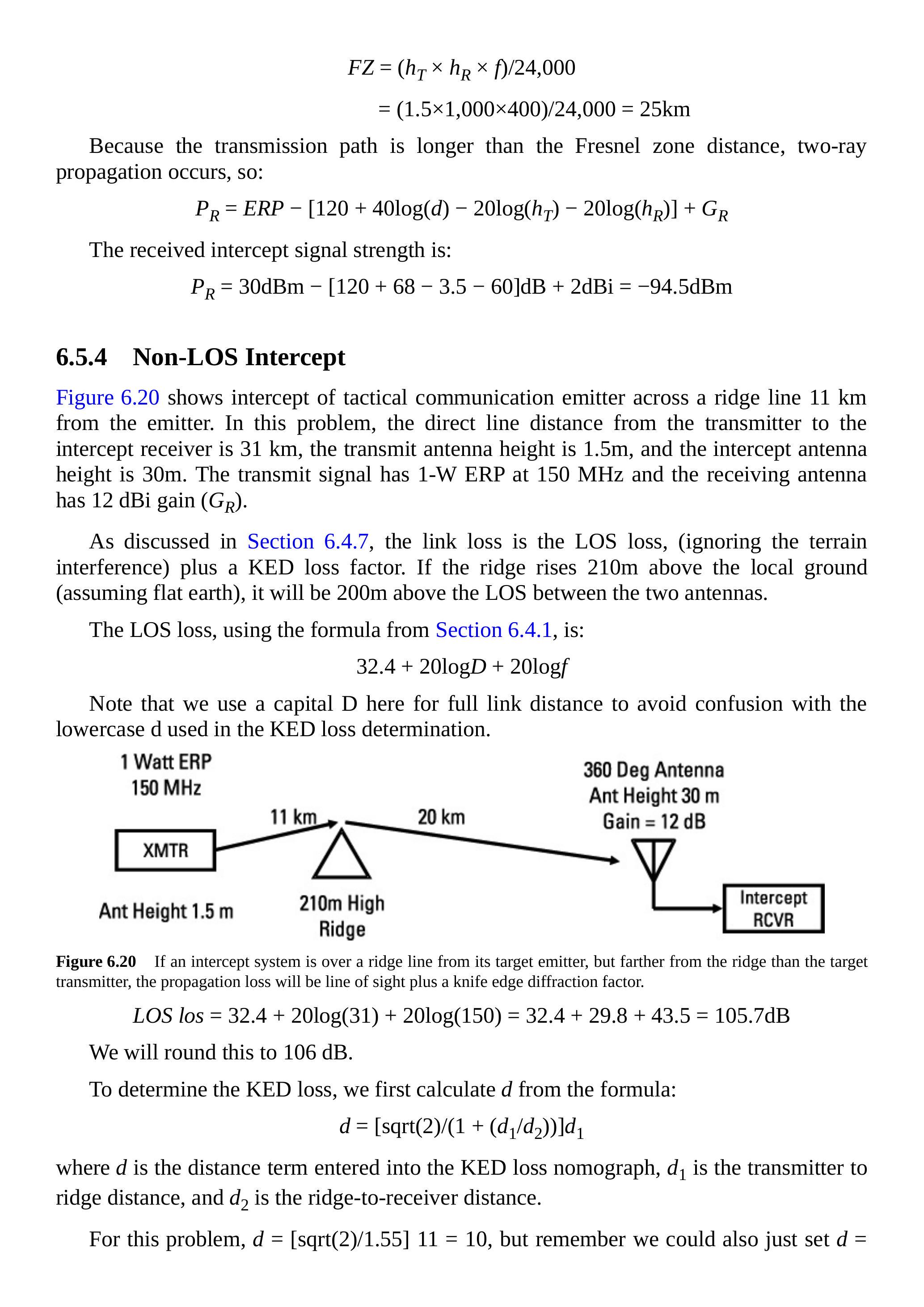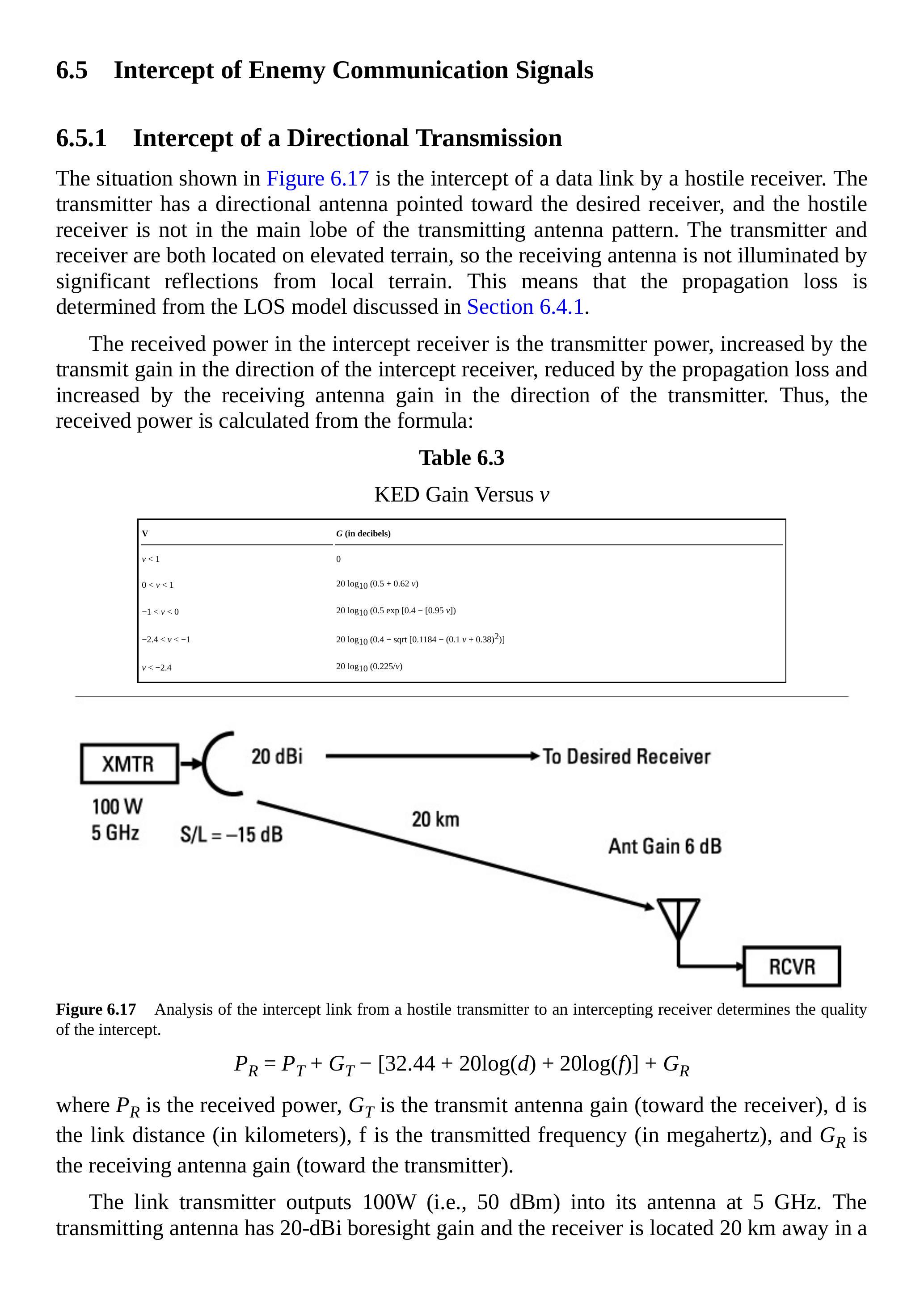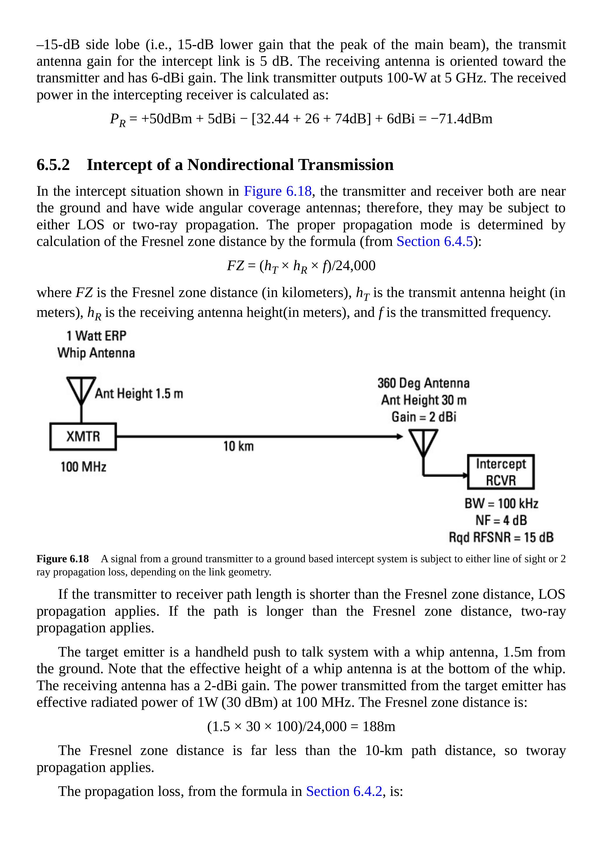 在第 6.4 节中,我们讨论了最常用来描述战术通信链路性能的三种传播模型。在第 6.7.3 节中,我们讨论了期望信号链路、截获链路和干扰链路,它们都是战术通信链路。重要的是要意识到,每条链路都可以采用任意传播模型。这也是我们在 \(J / S\) 方程中将损耗项保留为一般损耗而没有简化公式去掉公共项的原因。