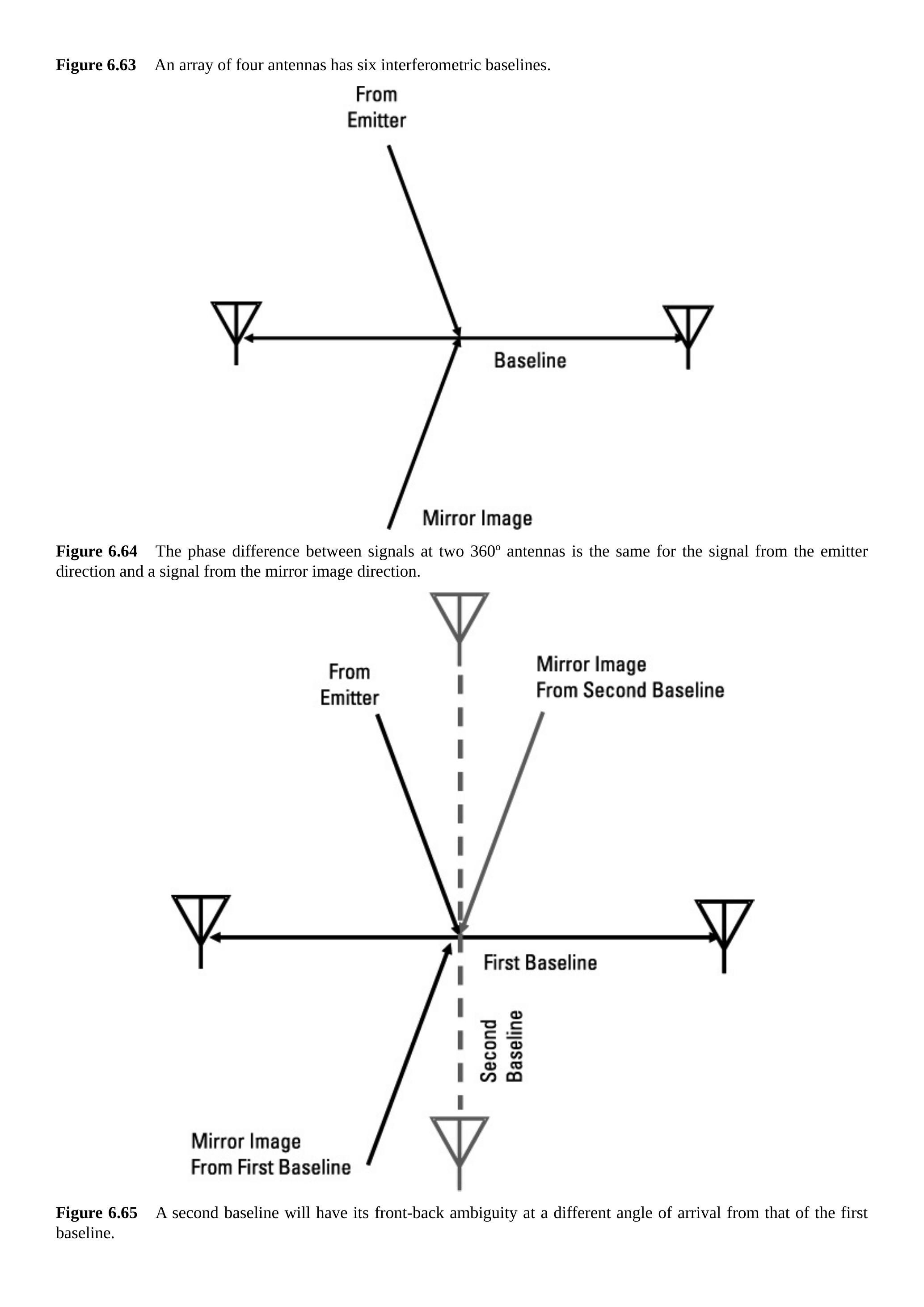 图 6.3 和图 6.4 展示了单向链路在电子战中的两个重要应用场景。图 6.3 显示了一个通信链路以及发射机到截收接收机的另一条链路。需要注意的是,发射天线对目标接收机和截收接收机的增益可能不同。图 6.4 显示了一个通信链路以及干扰机到接收机的另一条链路。在这种情况下,接收天线对目标发射机与干扰机的增益也可能不同。这两幅图中的每条链路都包含图 6.2 所示的要素。