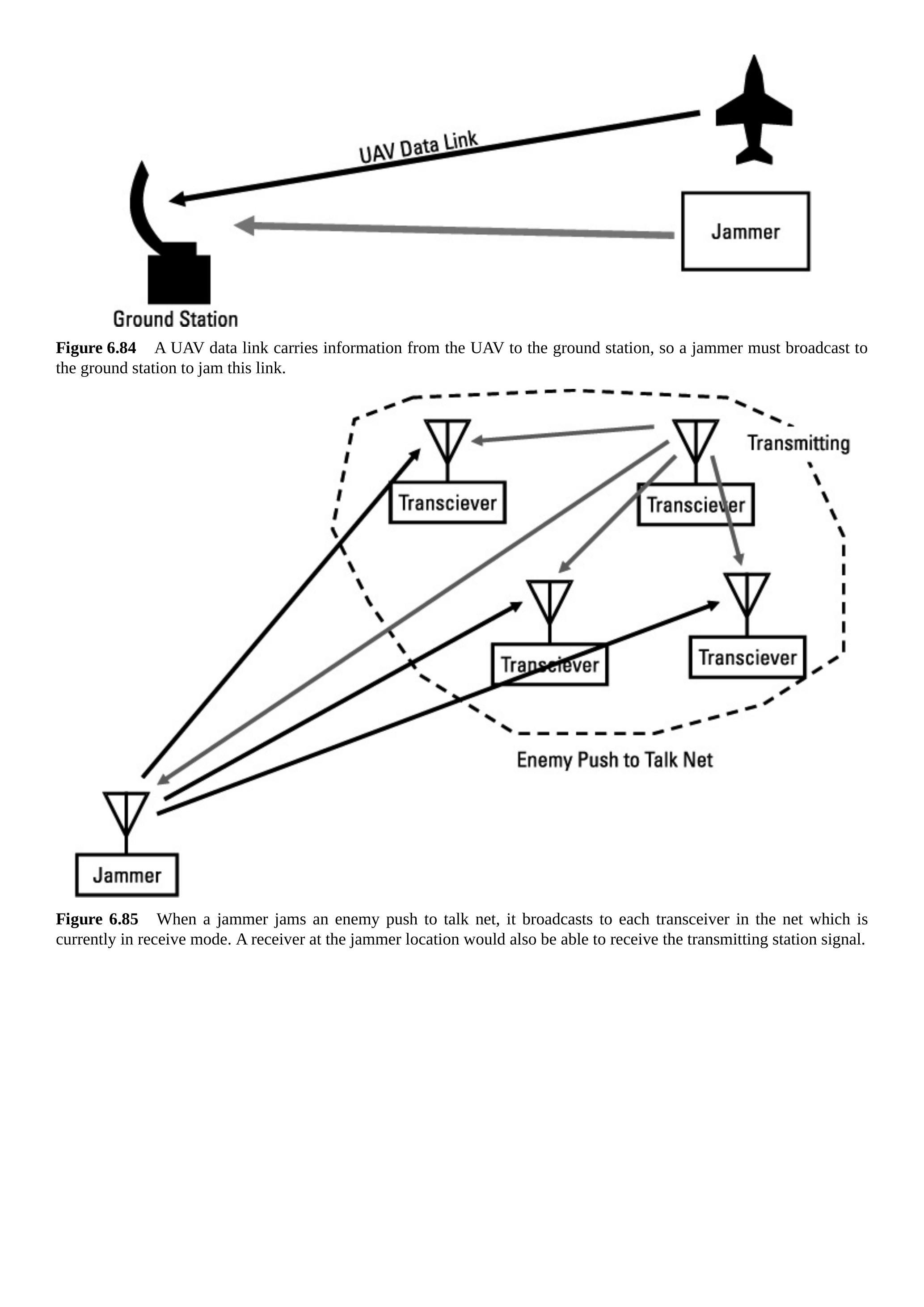 你总是干扰接收机,而不是发射机。这似乎很显而易见,但在复杂情况下容易混淆。在这一点上,雷达干扰是一个特别容易产生混淆的来源。雷达通常将发射机和接收机设置在同一位置(通常使用同一天线),因此希望采用反向指向的方式干扰雷达,即将干扰信号发射到发射信号源所在的位置。由于通信信号必须将发射机和接收机设置在不同位置,因此你需要记住干扰的是接收机(而不是发射机)。例如,如图 6.84 所示,当你干扰无人机(UAV)数据链时,干扰信号必须指向地面站,因为数据链将信息从无人机传输到地面站。指向无人机的干扰不会影响数据链,因为数据链是从无人机到地面站传输信息的。