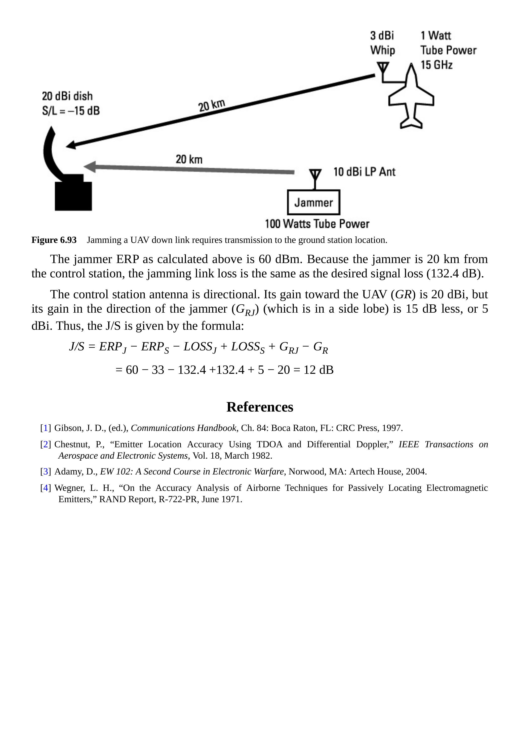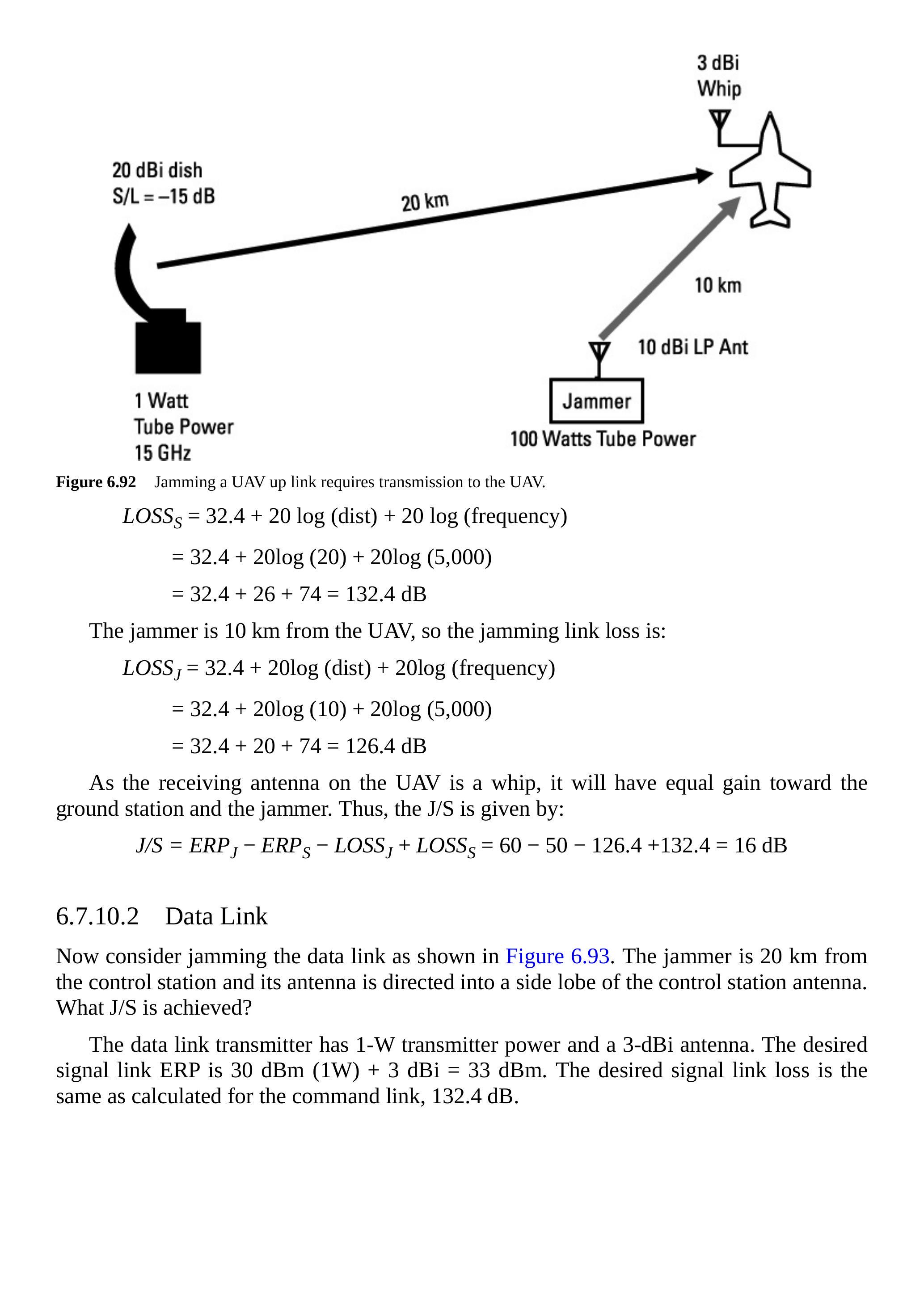 首先考虑干扰指令链路,干扰机天线指向 UAV,如图 6.92 所示。实现的 \(\mathrm{J} / \mathrm{S}\) 为多少?