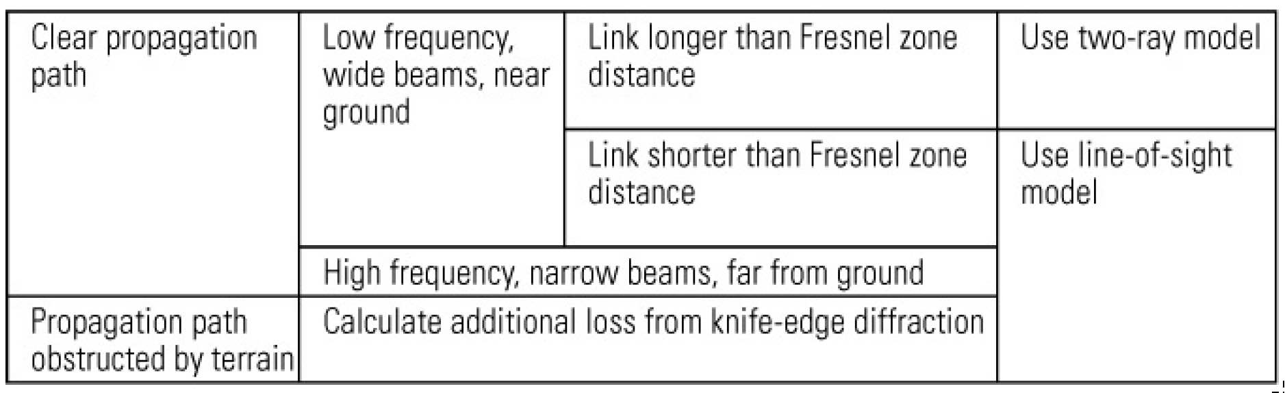 | 清晰传播路径 | 低频、宽波束、近地面 | 链路长于菲涅尔区距离 | 使用双射线模型 |