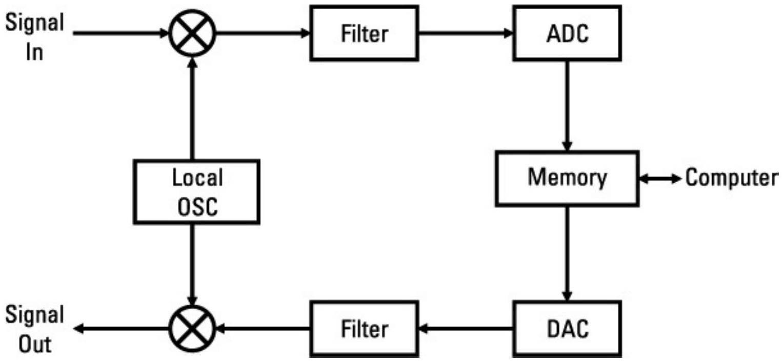 如图 8.1 所示,DRFM 将接收信号下变频至适当的中频(IF)以便数字化。随后,对 IF 信号的带宽进行数字化处理。数字化后的信号被存入存储器,供计算机传输和处理。计算机对信号进行必要的分析和修改,以支持所采用的干扰技术。随后,修改后的数字信号被转换回模拟射频(RF)。该信号使用与原始频率转换相同的本振(LO)进行频率回转换。使用单一本振可保持信号在下变频和上变频过程中的相位一致性。