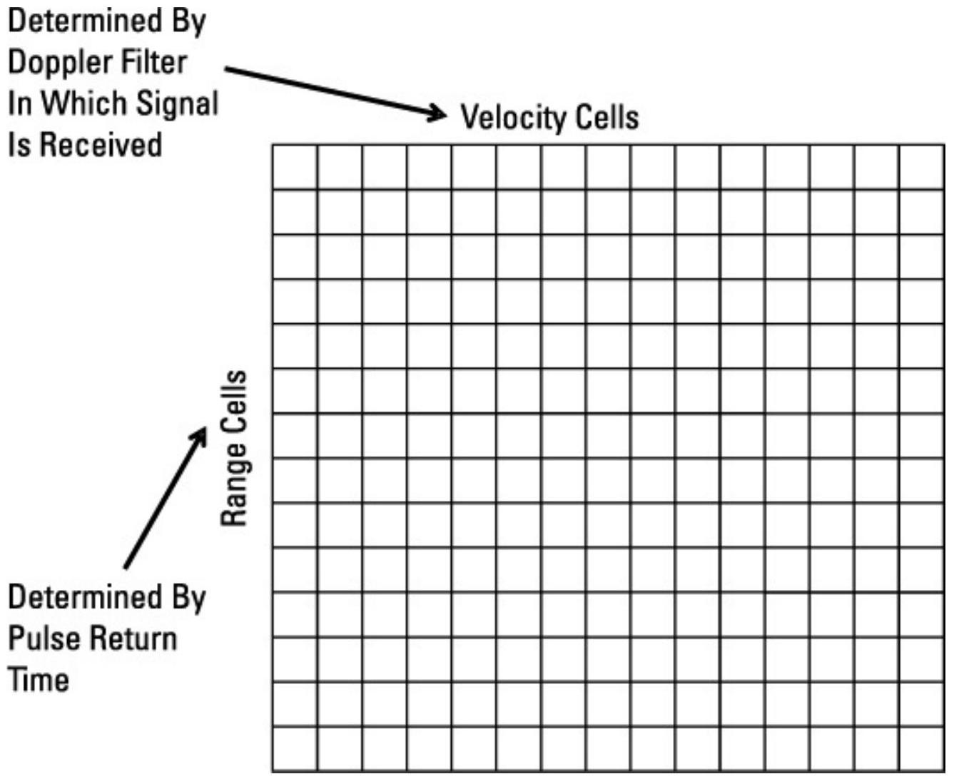 图 8.5 PD 雷达的处理硬件和软件包括每个接收脉冲的时间与径向速度矩阵。