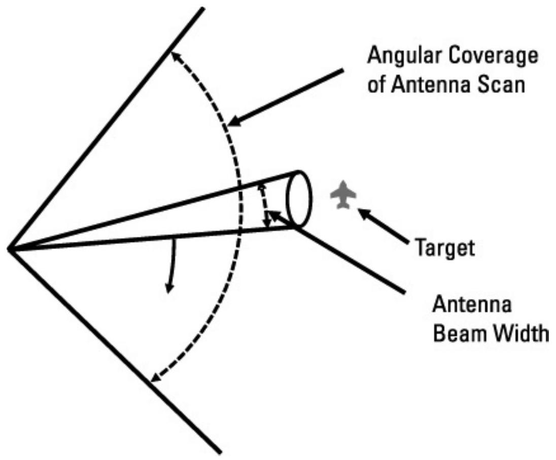 图 8.6 扫描雷达照射目标的时间取决于波束宽度、扫描速率和角度覆盖范围。