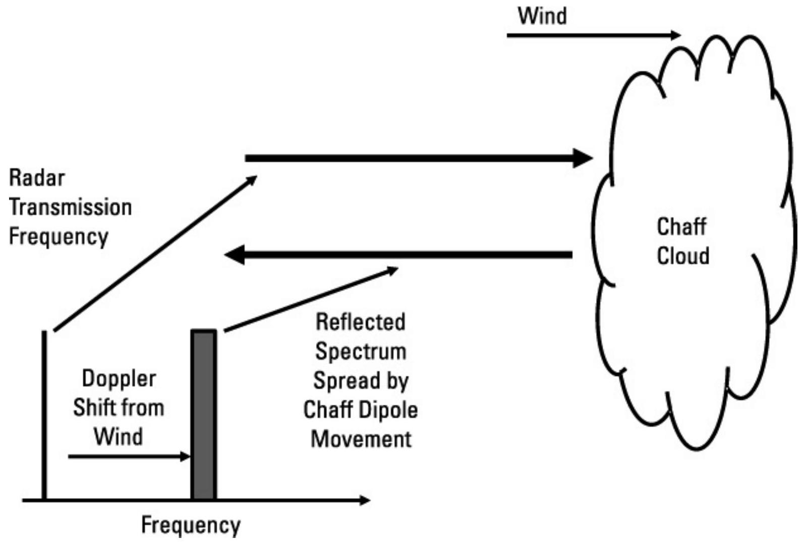 图 8.7 铝箔云中偶极子的随机运动导致雷达信号从云中反射时频率扩展。风力导致云的移动,从而产生频移。
