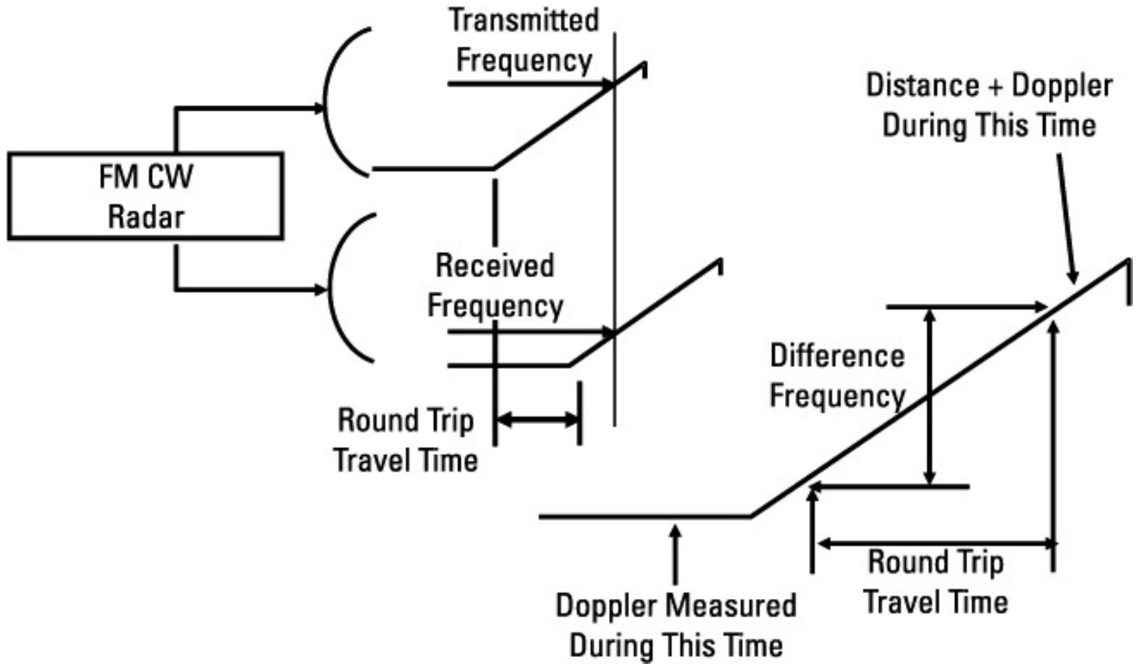 图 8.9 CW 雷达的频率调制允许通过比较发射和接收信号频率来确定目标距离。