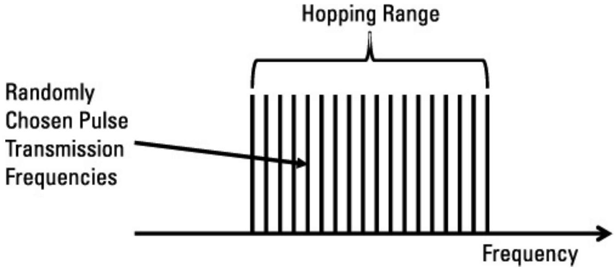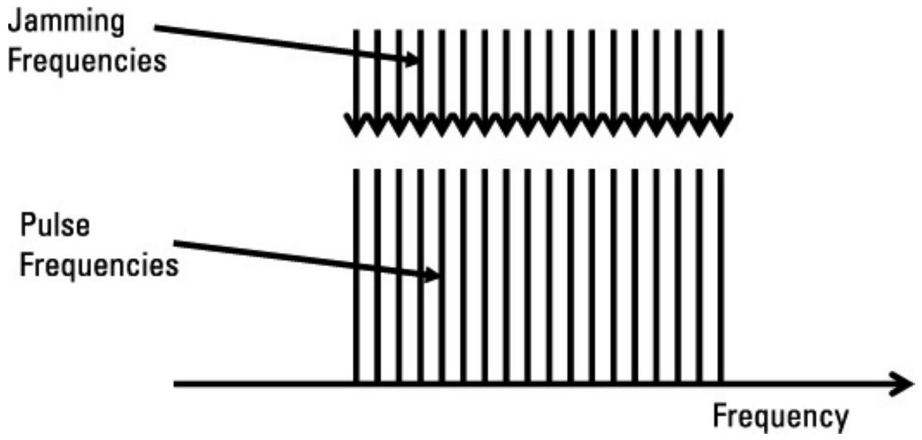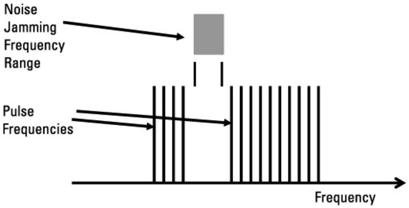 频率跳变雷达不仅为每个脉冲选择跳变范围内的随机频率,还可以具有“最少干扰频率”功能,即雷达会跳过在这些频率下干扰导致皮肤回波质量下降的频率。每个脉冲都会被发射,但如图 8.11 所示,受干扰的频率不会被选择。