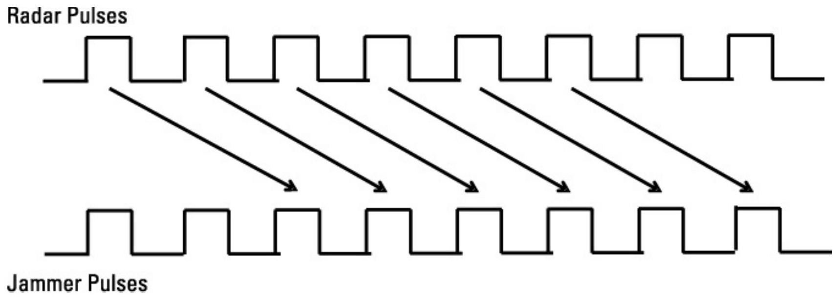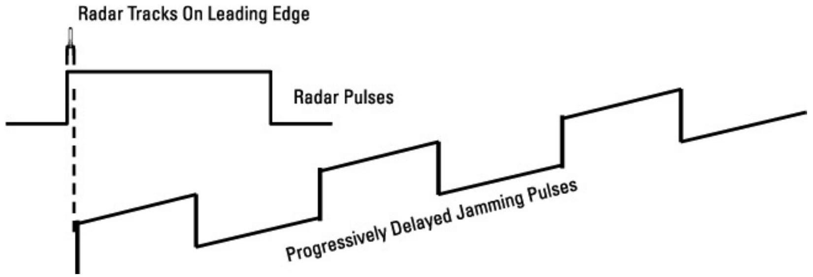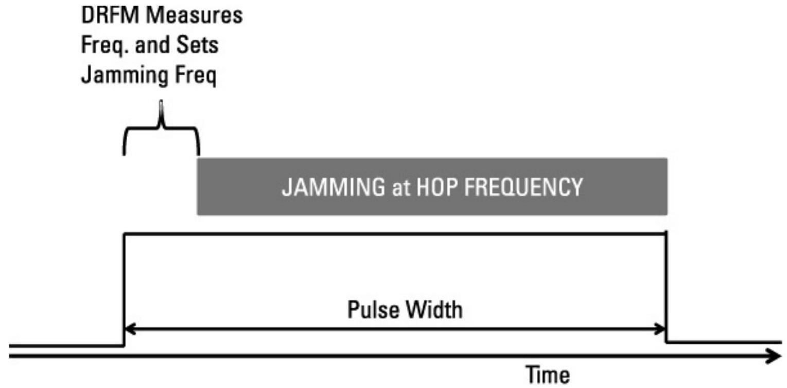 配备 DRFM 的干扰器可以同时设置干扰脉冲的脉冲时序和频率,使其与真实回波一致,从而使距离门脱锁(RGPO)、距离门拉入(RGPI)和其他假目标干扰技术有效。