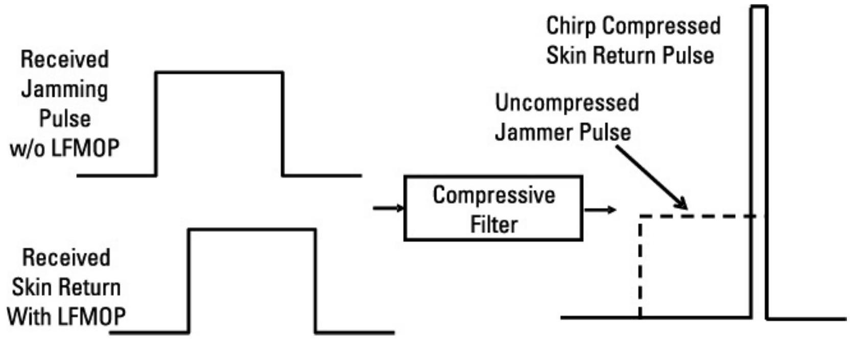 图 8.18 在雷达接收机处理中,皮肤回波脉冲通过压缩接收机被压缩。干扰脉冲未被压缩,因为它没有 LFMOP 调制。