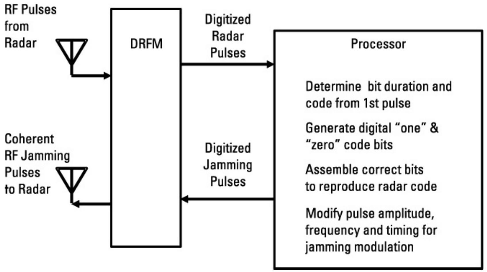 当接收到的雷达传输中的所有脉冲都相同时,DRFM 及其相关处理器分析接收到的第一枚脉冲,并生成具有适当调制的干扰脉冲,以干扰传输中的每个后续脉冲。所需的处理延迟足够短,可在脉冲间隔期间完成必要的处理。这一时间通常为几十微秒到几毫秒。