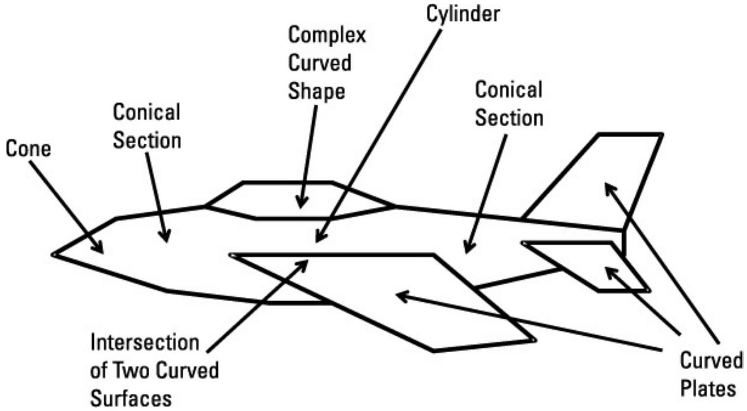 图 8.27 飞机可以被表征为大量单独形状。可以为每个形状组件制定 RCS 公式,作为方位角、材料、表面和频率的函数。飞机的雷达散射截面由这些公式组合计算得出。
