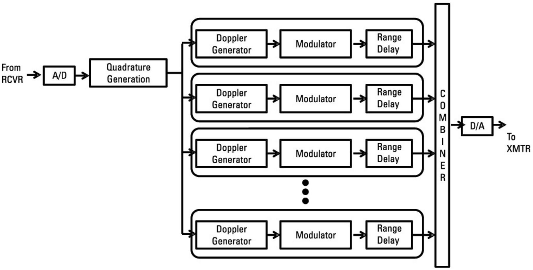 随着 FPGA 的引入,单个 DRFM 板可以生成 12 个散射点的回波。每个散射点信号都有独特的调制,包含相对于当前目标方位、速度以及三维角速度的多普勒频移和距离延迟。