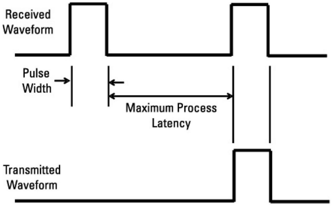 图 8.34 如果每枚脉冲都是唯一的,重发脉冲的宽度将被处理延迟时间缩短。