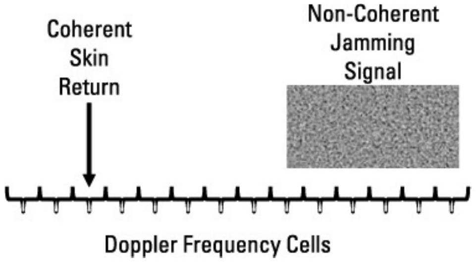 图 8.35 相干雷达在信号频率单元内产生皮肤回波,而非相干干扰信号则占据多个频率单元。