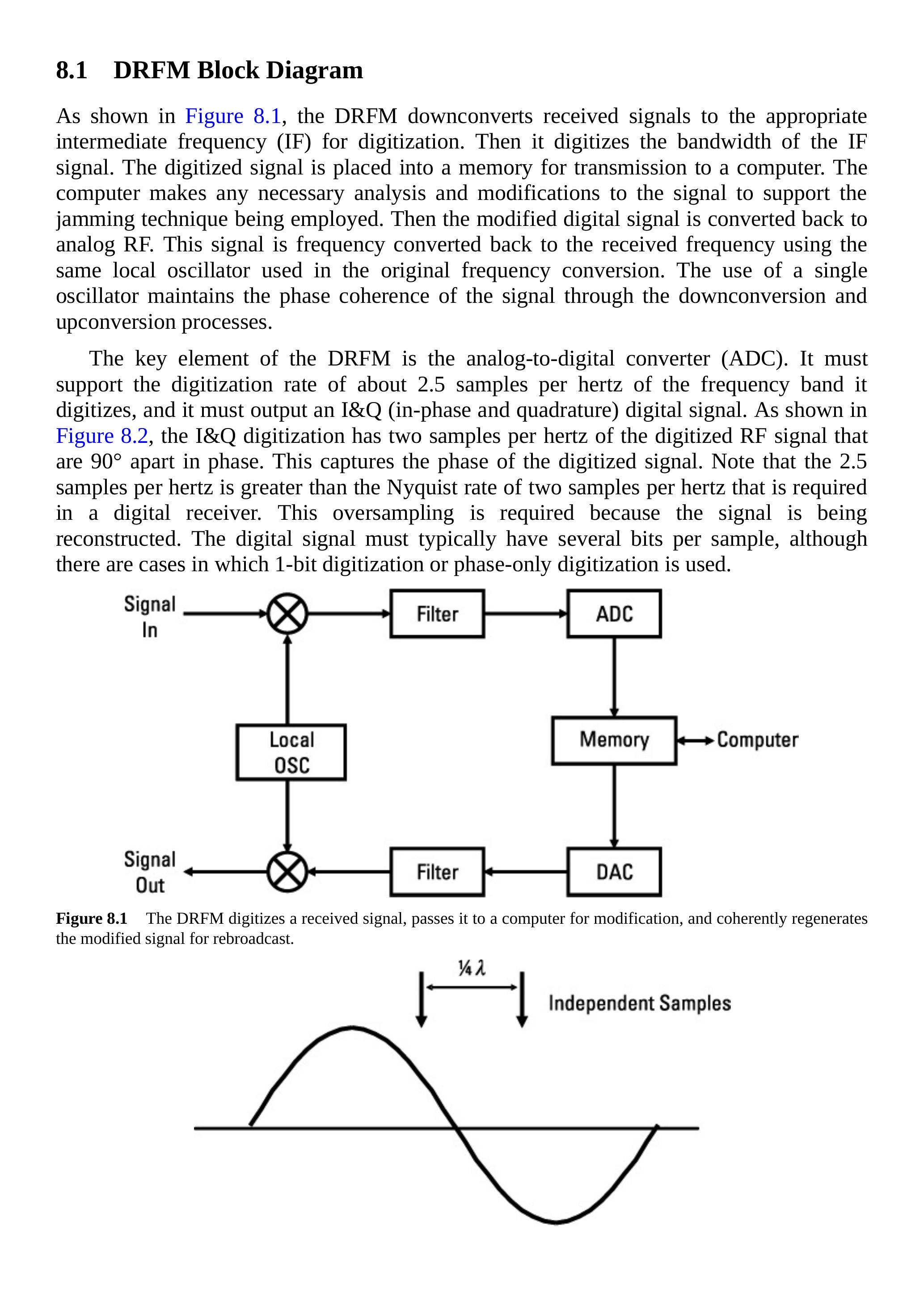 如图 8.1 所示,DRFM 将接收信号下变频至适当的中频(IF)以便数字化。随后,对 IF 信号的带宽进行数字化处理。数字化后的信号被存入存储器,供计算机传输和处理。计算机对信号进行必要的分析和修改,以支持所采用的干扰技术。随后,修改后的数字信号被转换回模拟射频(RF)。该信号使用与原始频率转换相同的本振(LO)进行频率回转换。使用单一本振可保持信号在下变频和上变频过程中的相位一致性。