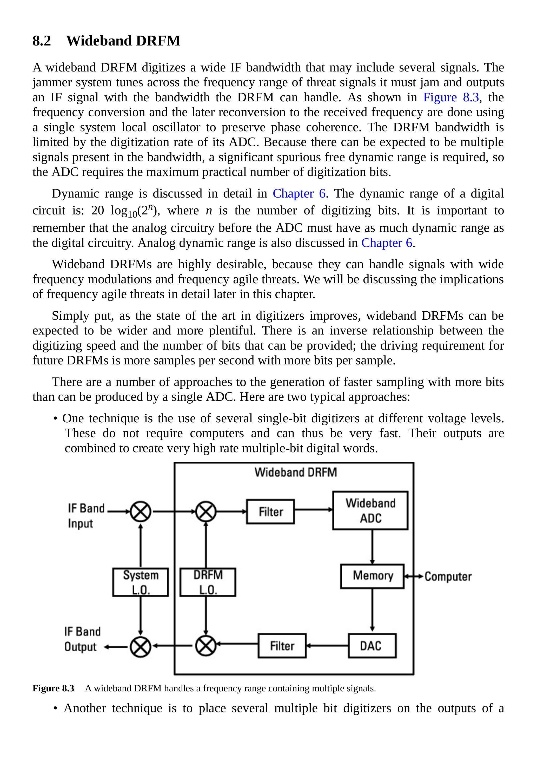 宽带 DRFM 对可能包含多个信号的宽 IF 带宽进行数字化处理。干扰系统在必须干扰的威胁信号频率范围内调谐,并输出 DRFM 可处理带宽的 IF 信号。如图 8.3 所示,频率转换及随后回转换至接收频率使用单一系统本振,以保持相位一致性。DRFM 的带宽受其 ADC 数字化速率限制。由于带宽内可能存在多个信号,因此需要显著的无杂散动态范围(SFDR),ADC 需要尽可能多的数字化比特。