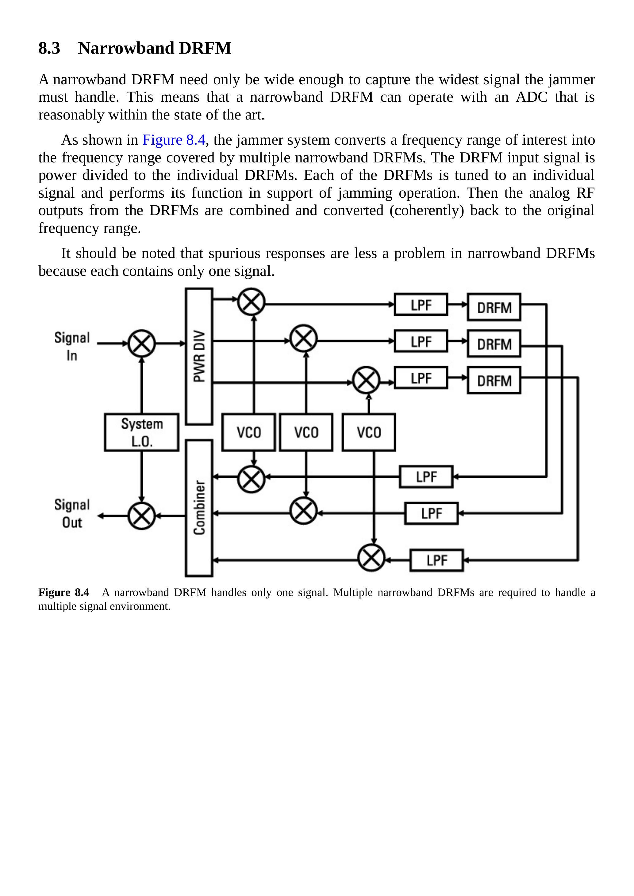 图 8.4 窄带 DRFM 仅处理一个信号。处理多信号环境需要多个窄带 DRFM。
