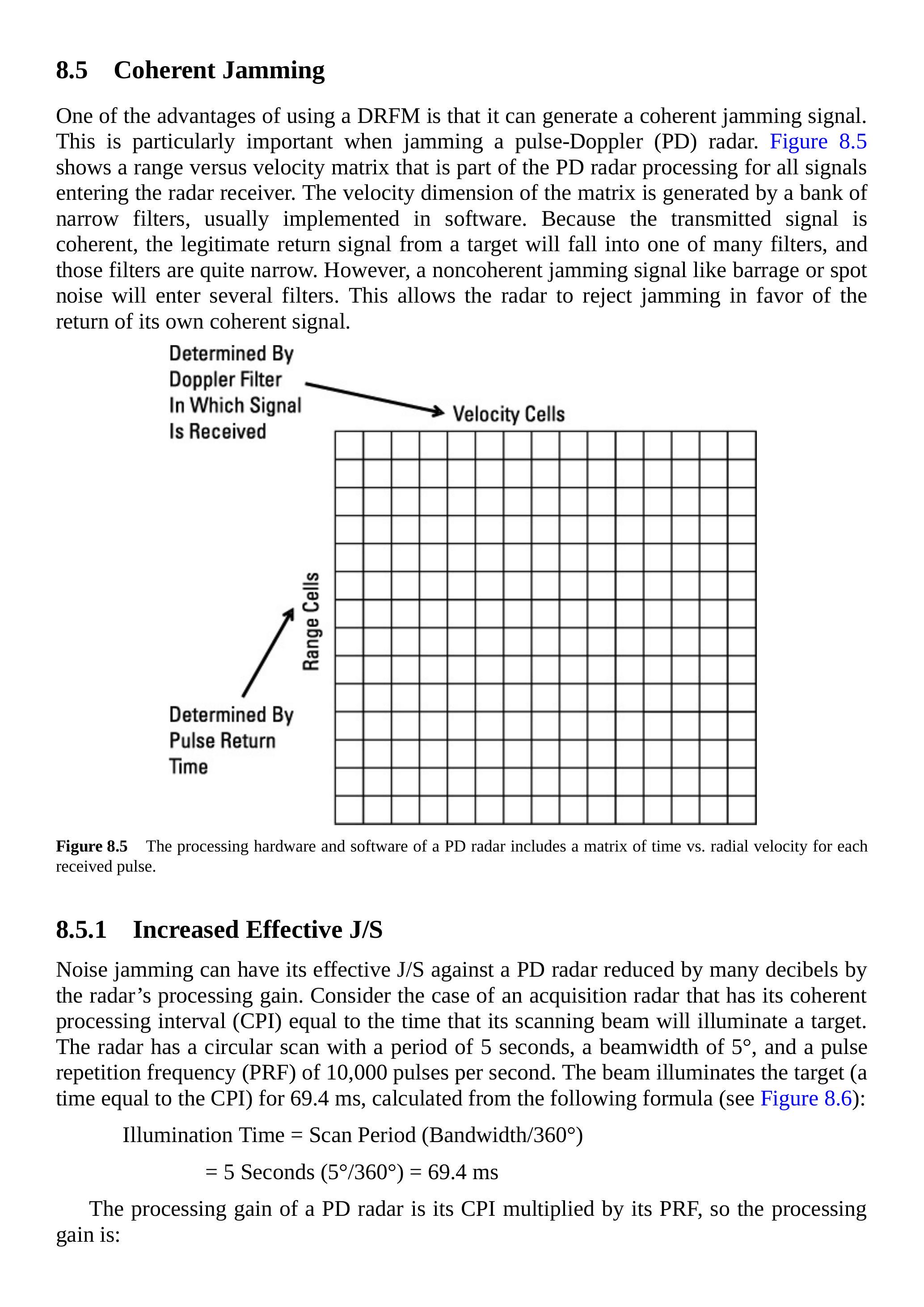 单个多普勒滤波器的带宽可以窄至 CPI 的倒数,即 14.4 Hz。这意味着雷达自身信号的目标反射会被增强 28.4 dB,而非相干干扰信号不会被增强。因此,落入 \(14.4-\mathrm{Hz}\) 滤波器内的相干干扰信号(由 DRFM 生成)将比同等干扰器有效辐射功率的非相干噪声干扰信号提供 28.4 dB 的更高干扰效果。