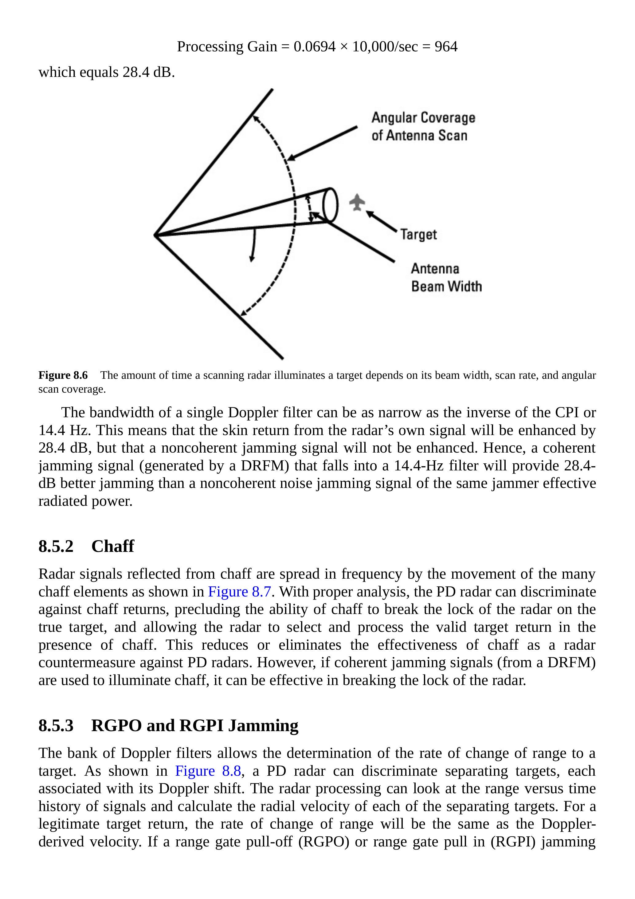 PD 雷达的处理增益等于其 CPI 乘以 PRF,因此处理增益为 28.4 dB。