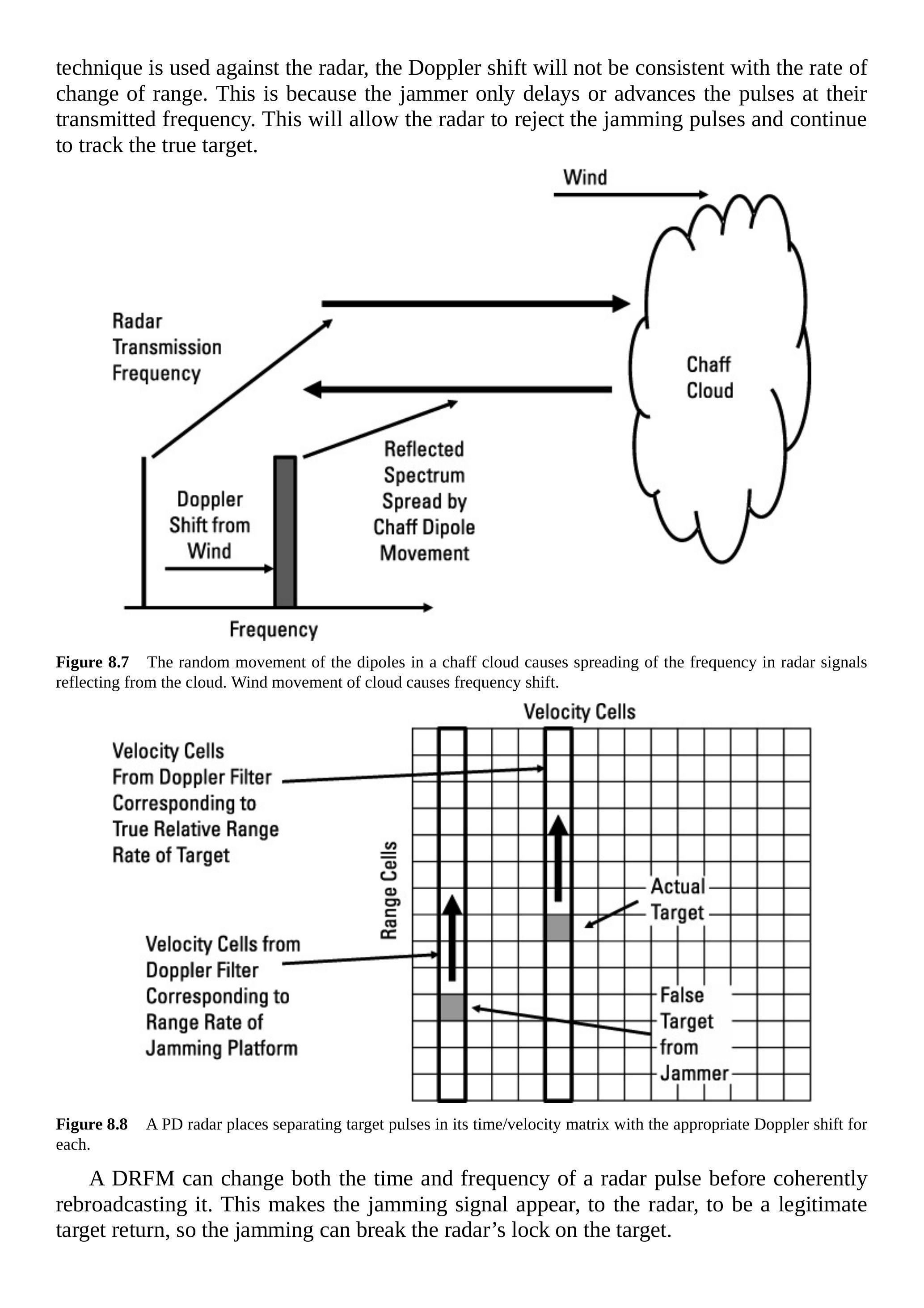 雷达信号从铝箔条反射时,由于大量铝箔条的运动而在频率上产生扩展,如图 8.7 所示。通过适当分析,PD 雷达可以区分铝箔条回波,从而防止铝箔条破坏雷达对真实目标的锁定,使雷达在铝箔条存在的情况下仍能选择并处理有效的目标回波。这降低或消除了铝箔条作为 PD 雷达对抗措施的有效性。然而,如果使用相干干扰信号(来自 DRFM)照射铝箔条,则可以有效破坏雷达的锁定。
